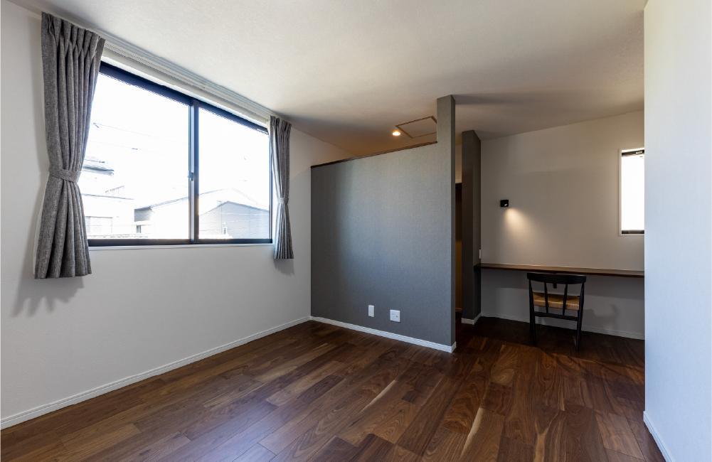 ご夫婦の衣類や小物類をはじめ、スーツケースのような大きなものも収納できるウォークインクローゼットを設けました。この広々とした収納スペースにより、室内をスッキリと快適に使うことができます。また造作のカウンターは、書斎スペースやドレッサーなど多目的に活用できます。