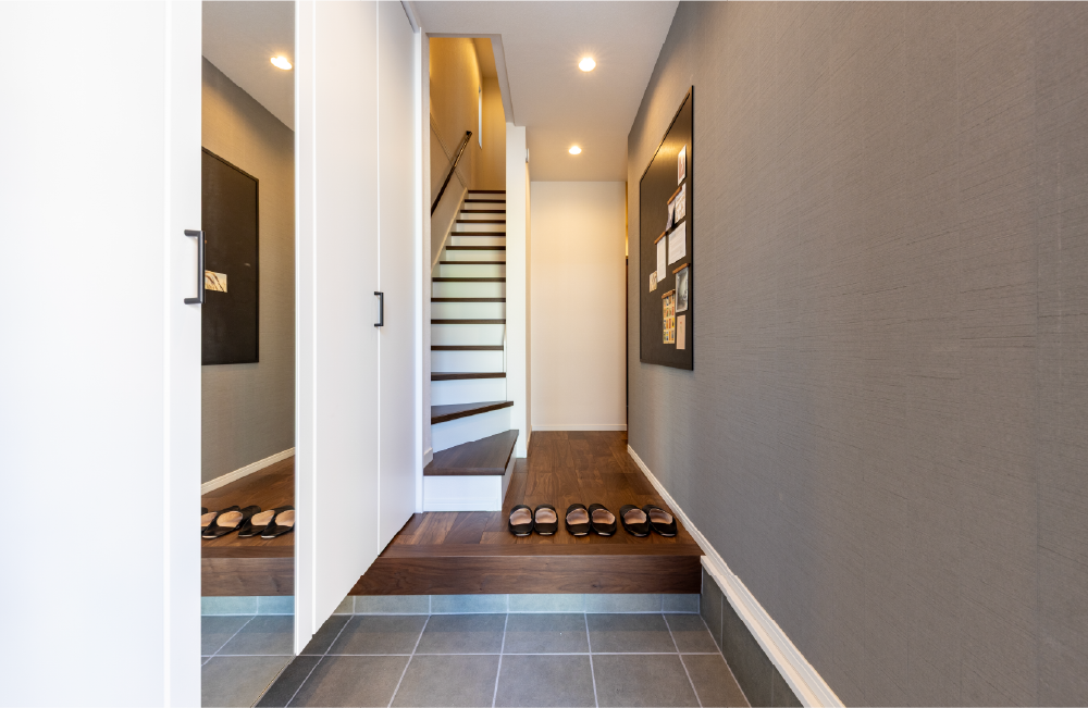 玄関ホールにマグネットボードを設置しました。お気に入りの写真やアートを飾れば、まるでギャラリーのような雰囲気となり、訪れる人の目を引く個性的な空間を作り出します。また、磁石付きのフックや棚を活用すれば、小物の収納もでき、日々の暮らしに彩りと便利さをプラスしてくれます。
