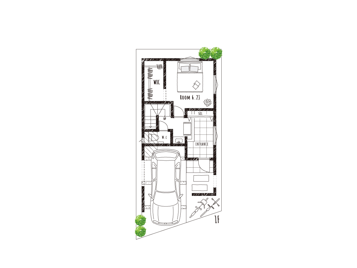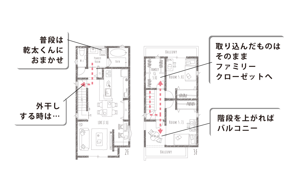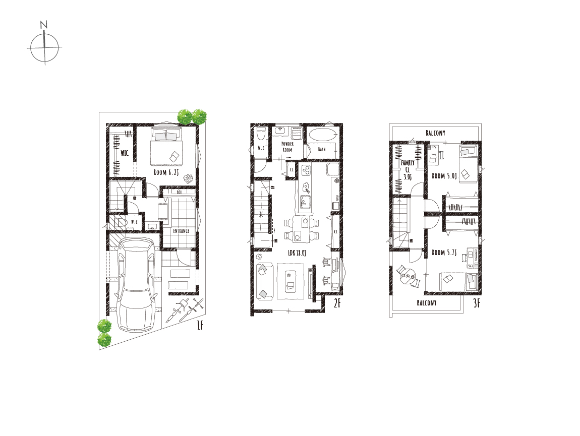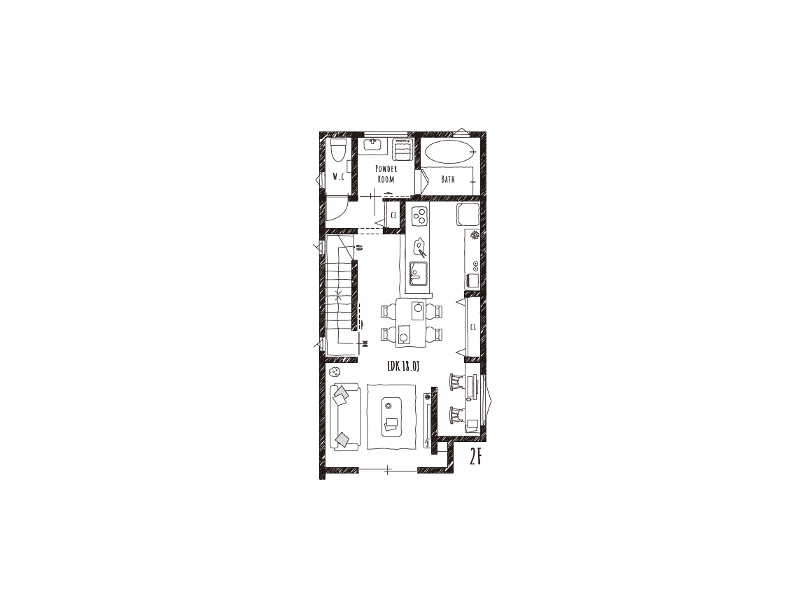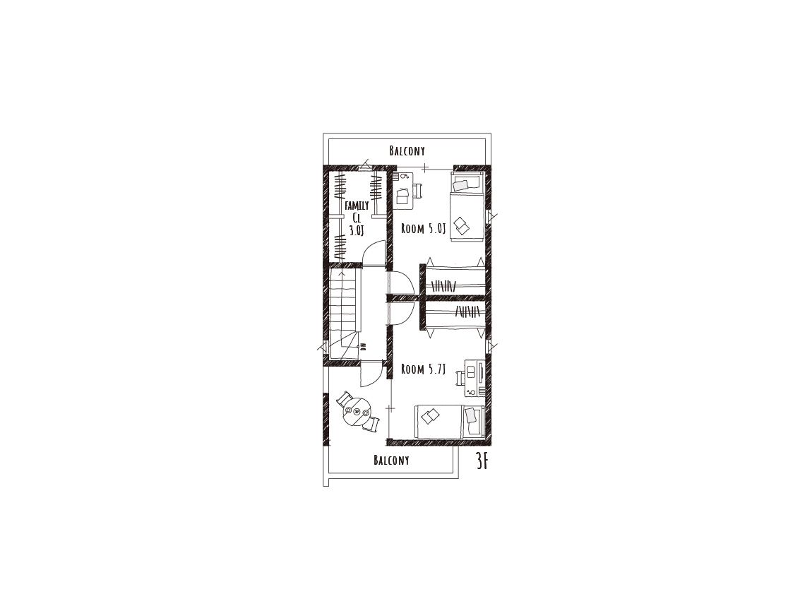 明るさと広がりを持たせたアイボリー色の床に、木目柄の建具を際立たせた温かみのあるラスティックな雰囲気の内装に、暮らしやすい広さと動線計画に加え、充実した設備や収納計画など、妥協なく細部にまでこだわったお家をつくりました。生活スペースを広く確保するため、2階はバルコニーをあえてなくしてLDKを広く取っています。併せて、洗面室に衣類乾燥機を設置することで普段の洗濯作業は3階まで干しに行く手間を無くし、2階で生活も家事も完結できるよう計画しました。