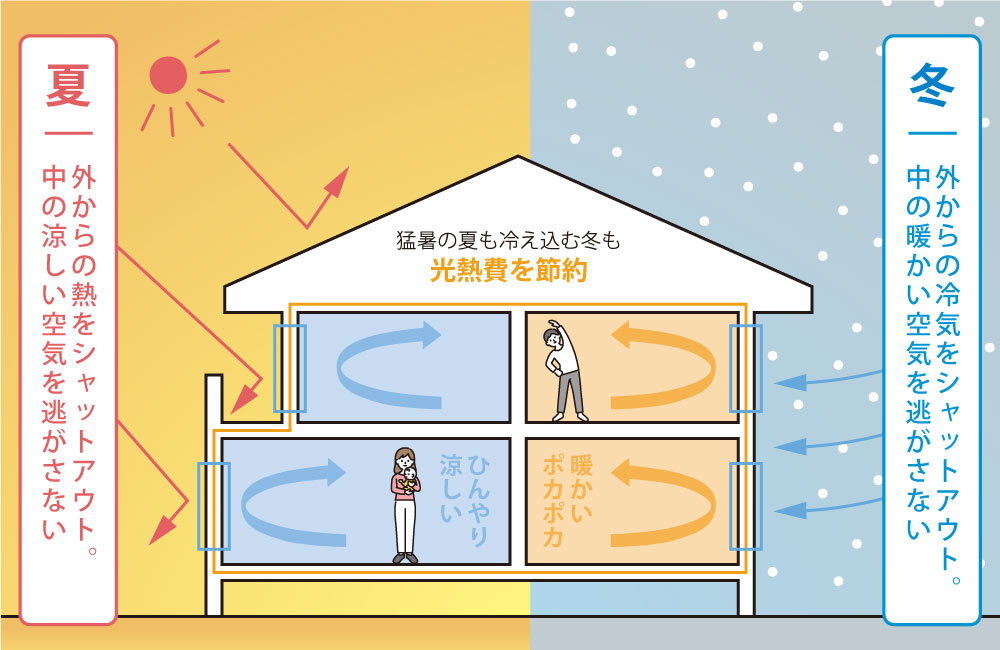 省エネ住宅は、従来の住宅と比べて断熱性や気密性が高く、防露や換気性能にも優れています。さらに断熱性能をZEH 基準まで高めたことで、一年を通して快適な住環境を保ち「冬は暖かく夏は涼しい」家族の健康にもつながる住まいです。