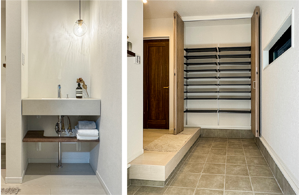 帰ってきてすぐ「手洗い・うがい」ができ、お客様にもためらわずに使っていただけるセカンド洗面と、ベビーカーもそのまま置ける奥行きのある広々玄関。玄関脇にあるので、手洗い習慣も付きやすく、主寝室からも近いので、寝る前や身支度の時に、わざわざ2階に上がる手間も省けます。また、お客様を迎えるスペースに設置しているので、インテリア性のあるカウンターとペンダントライトを選びました。