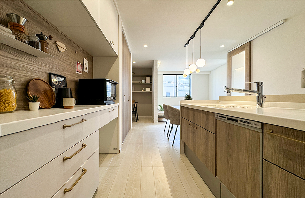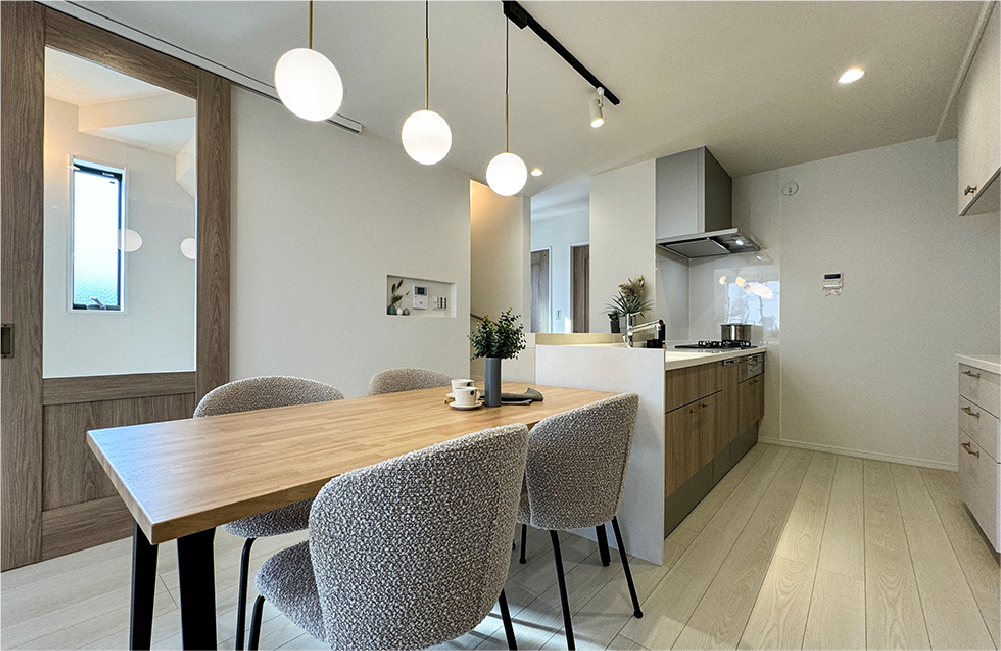 横に移動するだけで配膳や後片付けができる、横並びダイニング。キッチン側に子どもを座らせて、家事をしながら子どもにご飯を食べさせることもできます。ダイニングの背面には収納を設け、調味料やストック用品など、ごちゃごちゃしたもの隠すことができ、すっきりと暮らせます。
