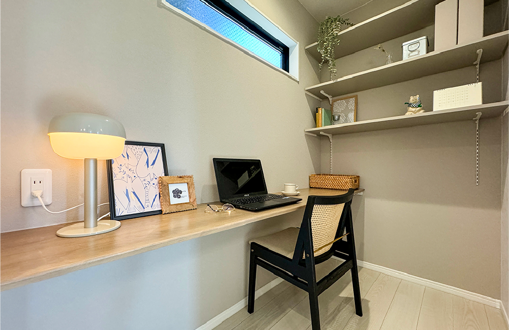 LDKの一角に、2人が並んで座れる広さのカウンターを設けました。キッチン・ダイニングから目の届くところにあるので、子どもが宿題したり、ちょっと作業がしたい時やご家族で使うPCコーナーにピッタリ。造り付けの書棚もあるので、ここをランドセルや教科書置き場にしておけば、宿題をやるときにも移動することなく勉強もはかどりそうです。リビングからは見えないので、多少散らかっていても気にならないのも嬉しいポイント。