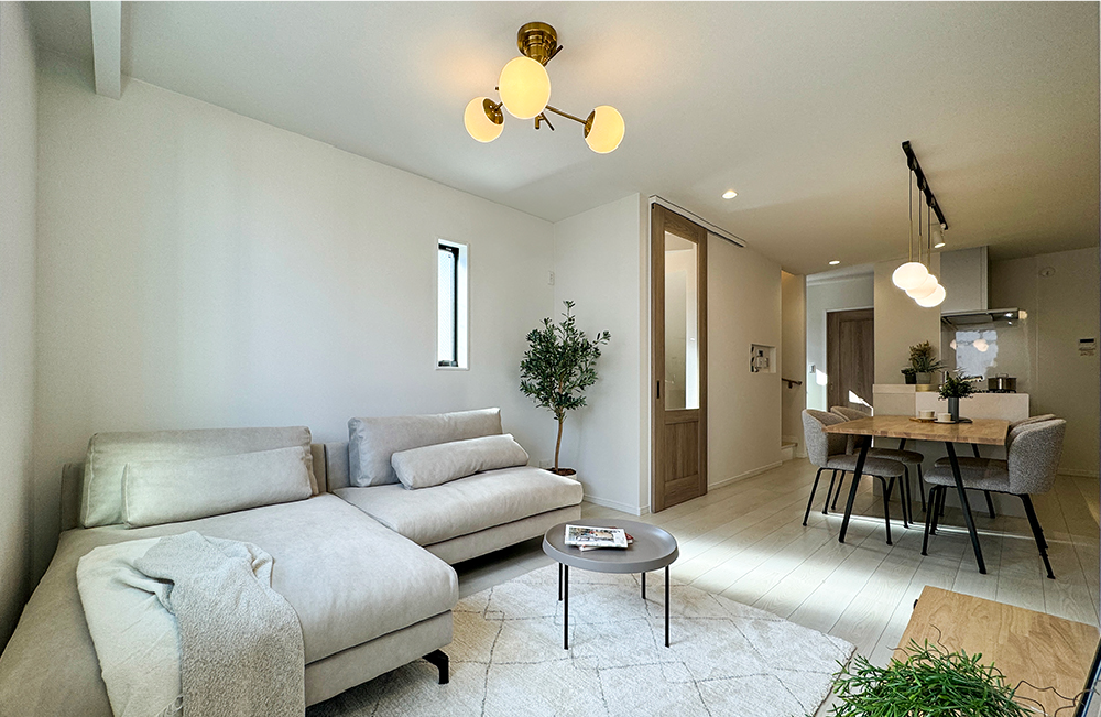 明るさと広がりをもたせたアイボリー色の床材に、グレージュの建具を合わせた、温かみあるやさしく大人っぽいテイストのお家です。ドアの取っ手や照明器具には、真鍮をあしらったものを施し、上品で落ち着く雰囲気に仕上げました。