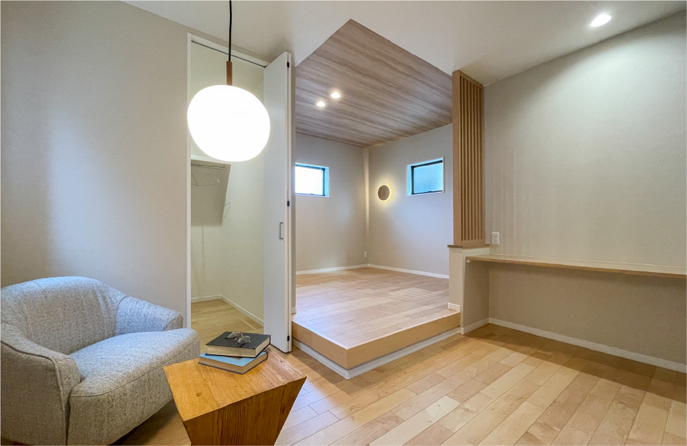 小上がりスペースで変化をつけた主寝室は、少し特別感のある、ホテルのような空間に。主寝室内にWICやカウンターを設けており、趣味の読書や、ちょっとしたワークスペースとしても◎また、ベッド以外にも1人掛けのソファーや、テレビなどを置くスペースがあり、自分時間を快適に過ごせます。主寝室は1日の始まりを迎える場所であり、1日の疲れを癒す大切な場所。ただ寝るだけでなく、リラックスしたり、趣味や自分の時間を楽しめる。そんな空間に仕上げました。