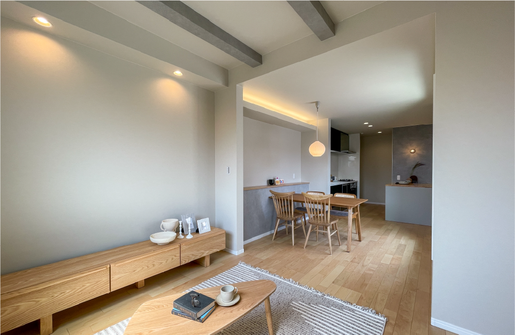 ダイニング上部には、間接照明を仕込んだ折り下げ天井を取り入れ、やさしい光でくつろぎの空間を演出。その下には、棚を設け、置き場所に困るテレビのリモコンやティッシュなど、ごちゃつきがちな小物をまとめて置くことができます。コンセントも付いているので、携帯の充電スポットにも◎。リビングには、見せ梁がアクセントとなる、折り上げ天井をあしらい、天井の高さにメリハリを付けることで、LDK空間に奥行きを持たせました。