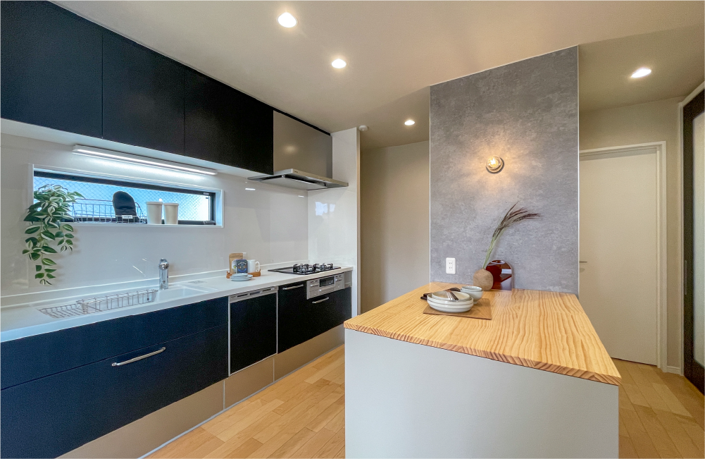 壁付けキッチンの後ろには、無垢材を使用した、たくさん収納できる作業台をご用意しました。前後に扉付きの収納があり、カップボードのように使え、作業スペースもしっかり確保したので、ご夫婦や子供と一緒にお料理を楽しめます。また、作業台の隣には、可動棚と固定棚を組み合わせた、パントリーも設けました。食器やストック品などを収納でき、家電製品やゴミ箱も隠しながら使えるので、いつでもスッキリとしたキッチン空間に。