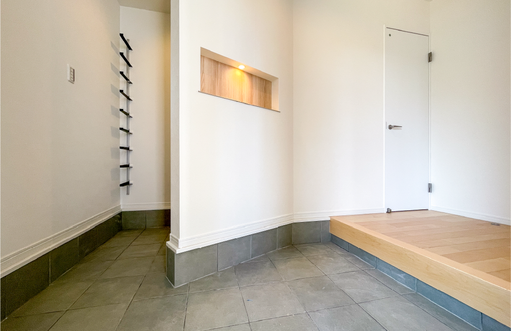 玄関奥の土間収納は、ベビーカーやゴルフバッグ・アウトドア用品などを置ける、ゆとりのあるスペース。玄関との間に仕切り壁を設けることで、急な来客でも、さっとモノを隠せます。また、正面には、間接照明を仕込んだニッチがあり、思い出の写真や、好きなインテリアを飾ると、さらにおしゃれな空間に。