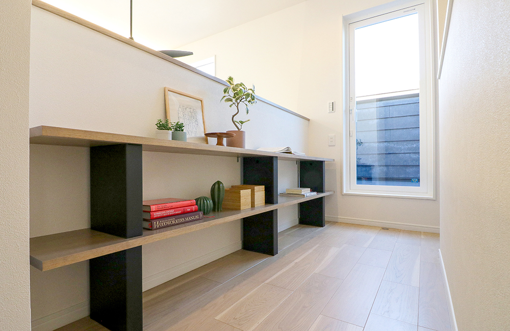 吹抜けに面した2階廊下の腰壁に、本やお気に入りの小物、グリーンなどを飾れる、造作棚を設けました。家族共有のライブラリースペースを作れば、本をきっかけに会話も広がり、みんなで読書を楽しむことができます。また、バルコニーの近くにあるので、外干しした洗濯物を畳んだり、仕分けをするスペースとしても使え、家事の時短にもなります。