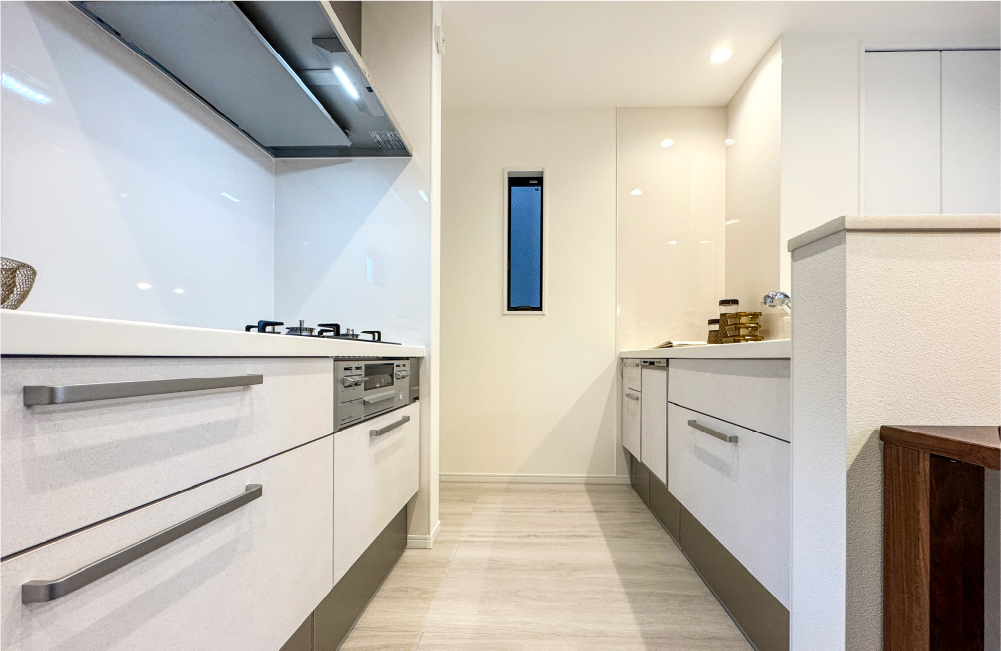 コンロとシンクを分けて2列に並べたⅡ型キッチンは、コンロからシンクへの移動も振り返るだけ。スペースが広くて作業分担もしやすいので、子どもも楽しくお料理のお手伝いができます。食器や家電、食品のストックなどは、すぐ横のパントリーにしっかり収納できます。