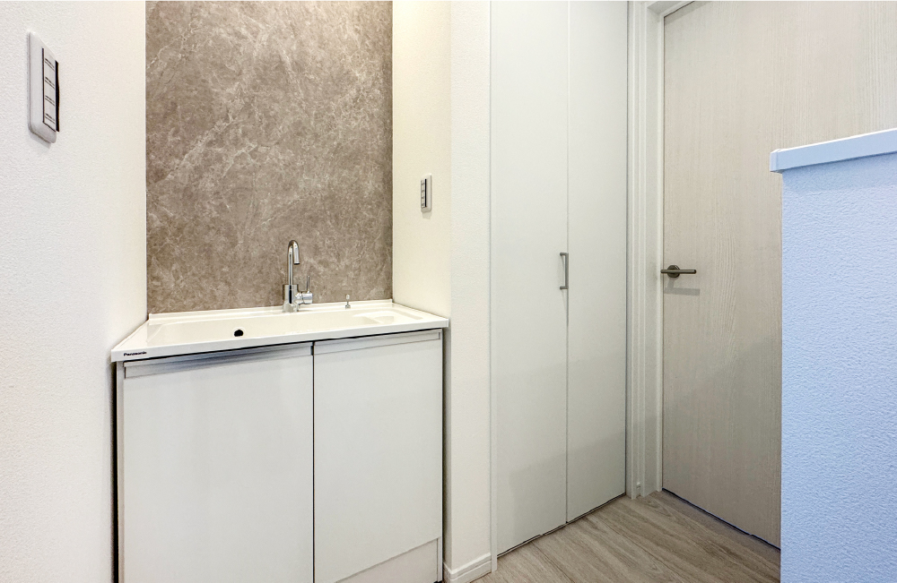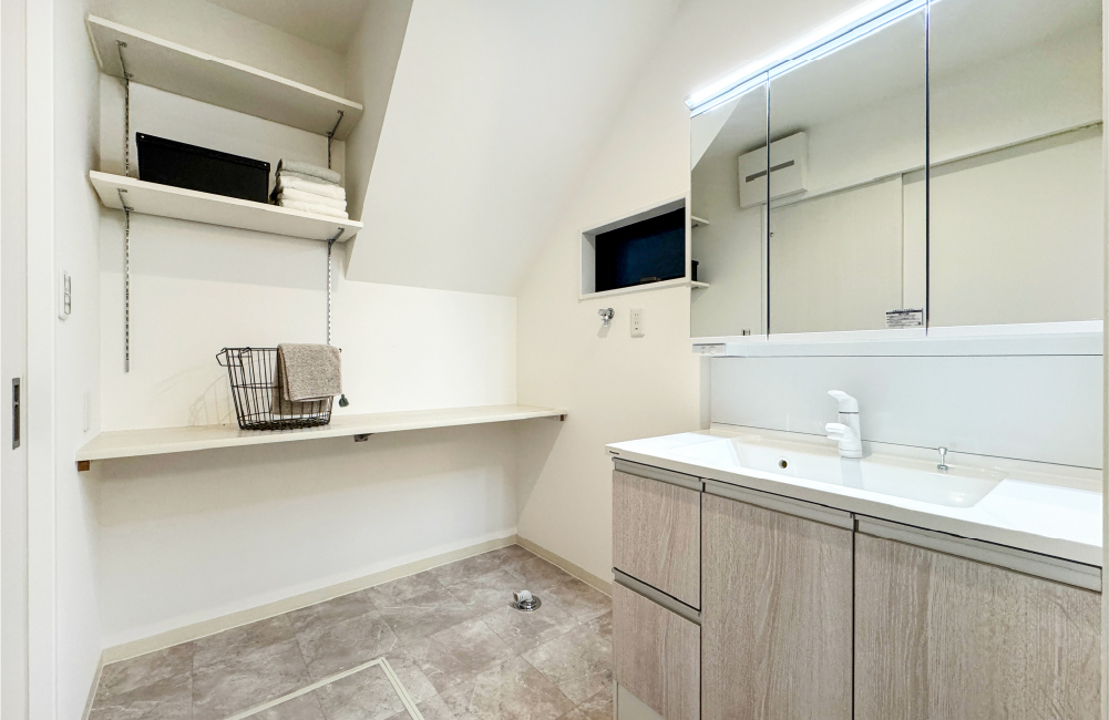 少し広めの洗面室には、可動棚とカウンターを設置しました。上部の可動棚は洗剤のストックやリネン類をすっきり収納でき、下のカウンターは洗濯物を畳んだり、アイロンがけをしたりするワークスペースとして活用できます。置き場所に困りがちなランドリーボックスも、カウンター下にすっきり収まる、使い勝手のいい空間です。