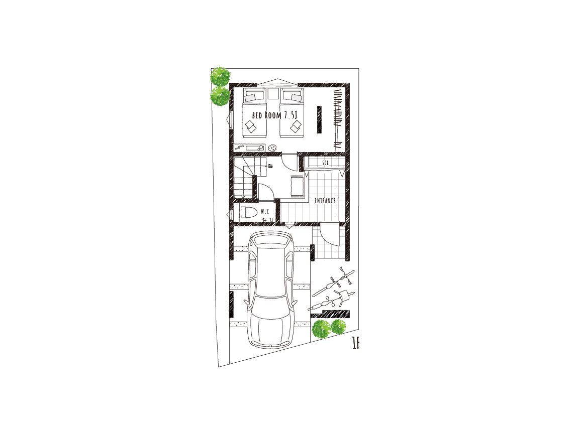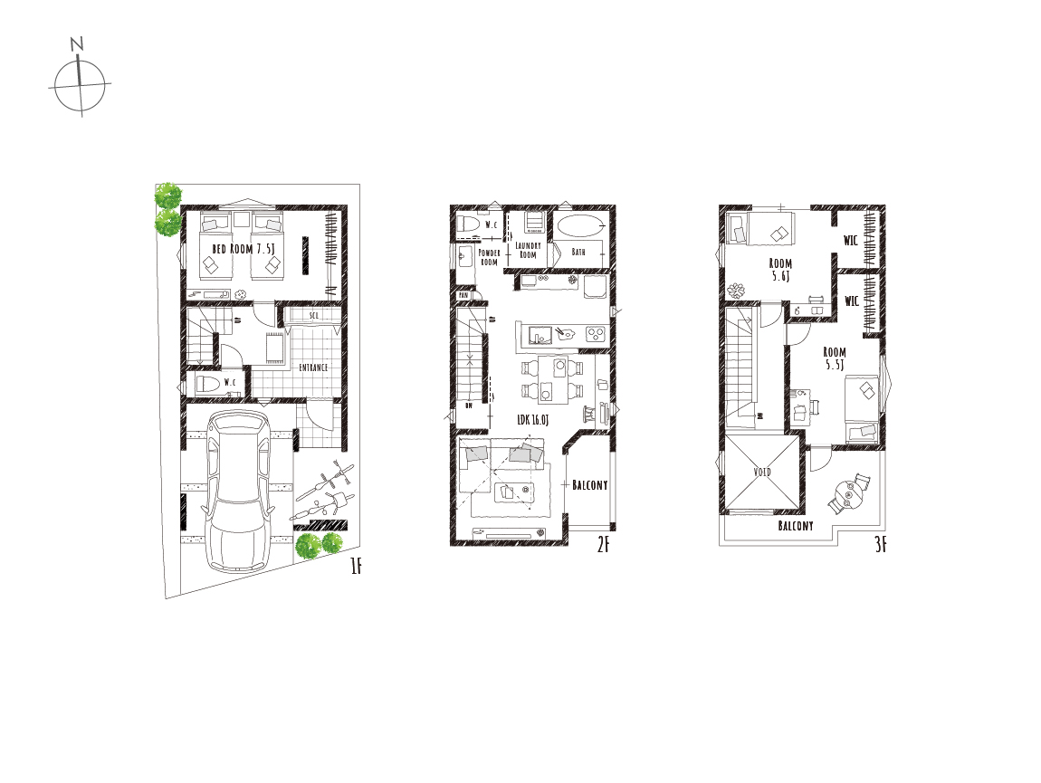 南向きで明るく開放的なこの家は、各階に豊富な収納を備え、ご家族の快適な暮らしを実現します。2階には吹抜けによる開放感あふれるリビングを配置し、心地よい自然光が注ぎ込みます。リビング横のバルコニーは、外の風を感じながらくつろげる空間に。同フロアのランドリールームからの動線も考慮し、家事もスムーズです。1階の主寝室には、整理整頓のしやすいウォークスルークローゼットを完備。3階には広いバルコニーと、ウォークインクローゼット付きの2つの洋室を設け、ご家族それぞれの収納ニーズに応える充実のプライベート空間を確保しています。