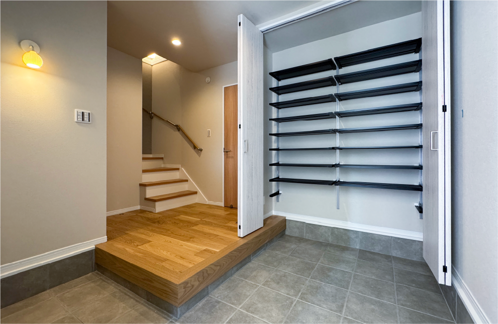 お子様と並んで靴の脱ぎ履きができ、ゆとりある動線を確保したL字型玄関。通り抜けもスムーズで、混雑時でもスペースに余裕があります。広い土間スペースは、ベビーカーや傘立ての設置にも対応できる実用的な設計です。