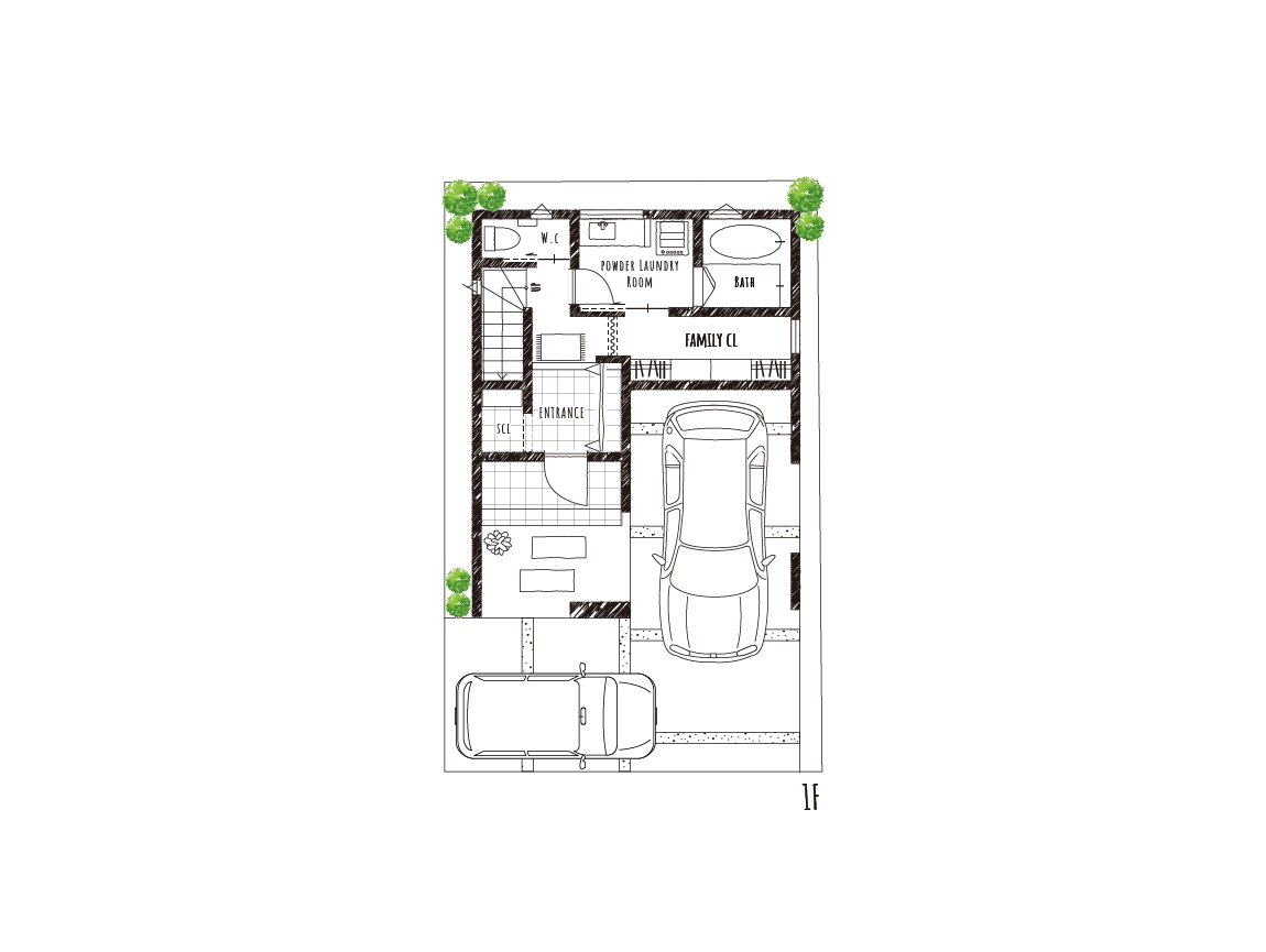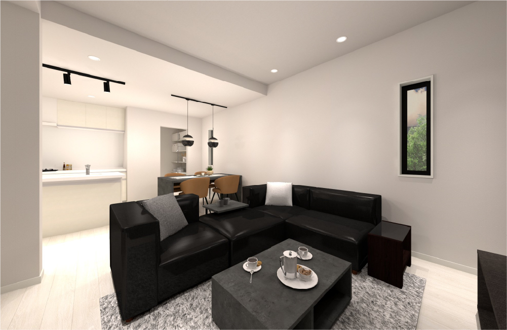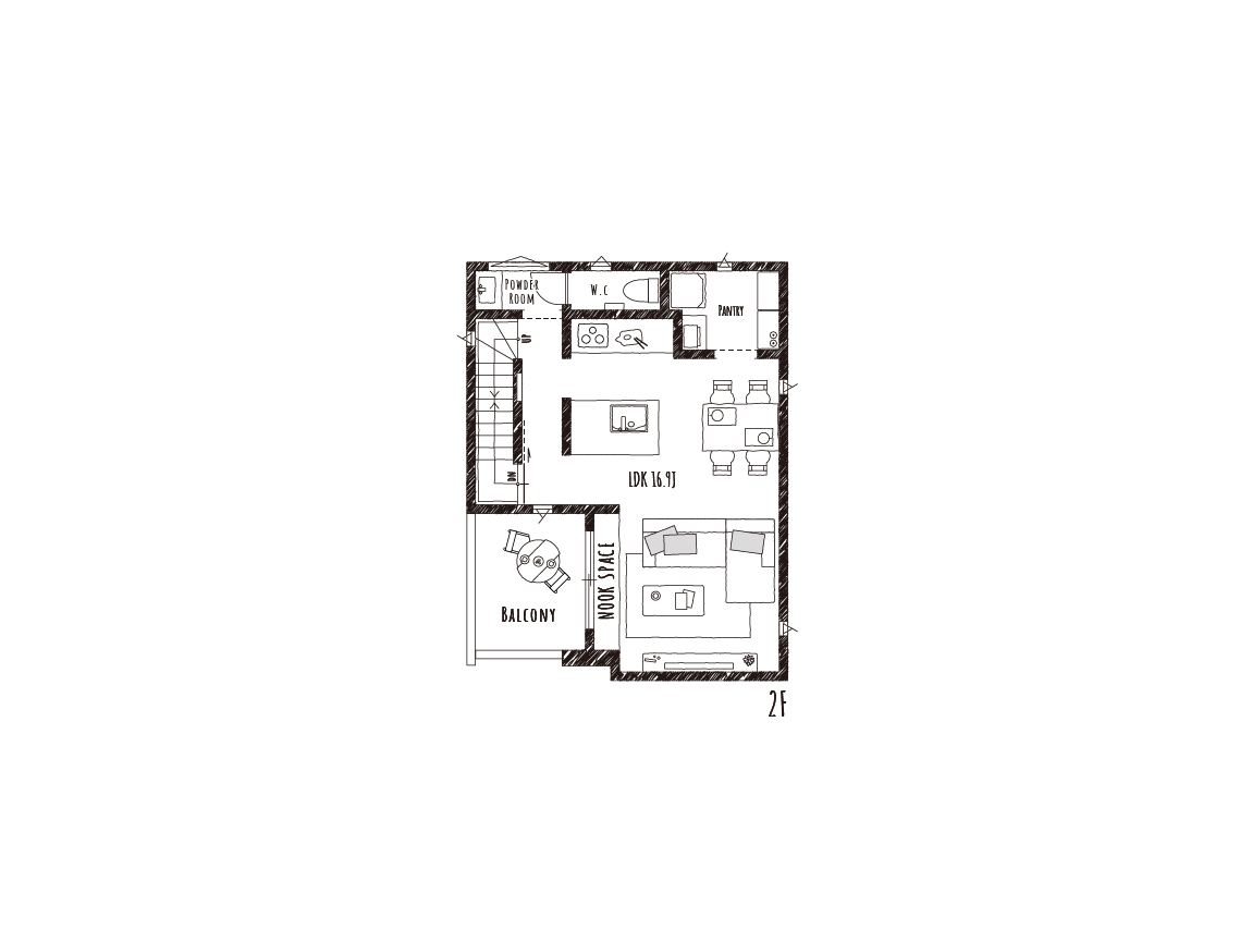 開放感いっぱいの空間に、家族の笑顔があふれるお家です。リビングには折り上げ天井を採用し、のびやかに広がるくつろぎの空間を実現しました。ソファや小上がりのヌックに腰掛けながら、ゆったりと団らんのひとときを楽しめます。玄関には、土間続きのシューズクローゼットや、ホールから直接アクセスできるファミリークローゼットを設置。そのまま洗面・脱衣室へとつながる動線上に、十分な収納スペースを確保しました。キッチンは、大型のパントリーを備えたⅡ型のセパレートタイプ。ダイニングを横並びに配置することで、料理の準備や後片付けがスムーズに行えます。さらに、間接照明やダウンライトを組み合わせた照明計画により、洗練された心地よい空間を演出。家族みんなが快適に暮らせる、工夫を凝らした住まいです。