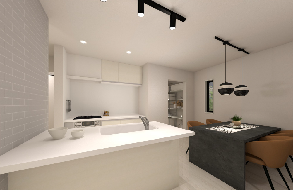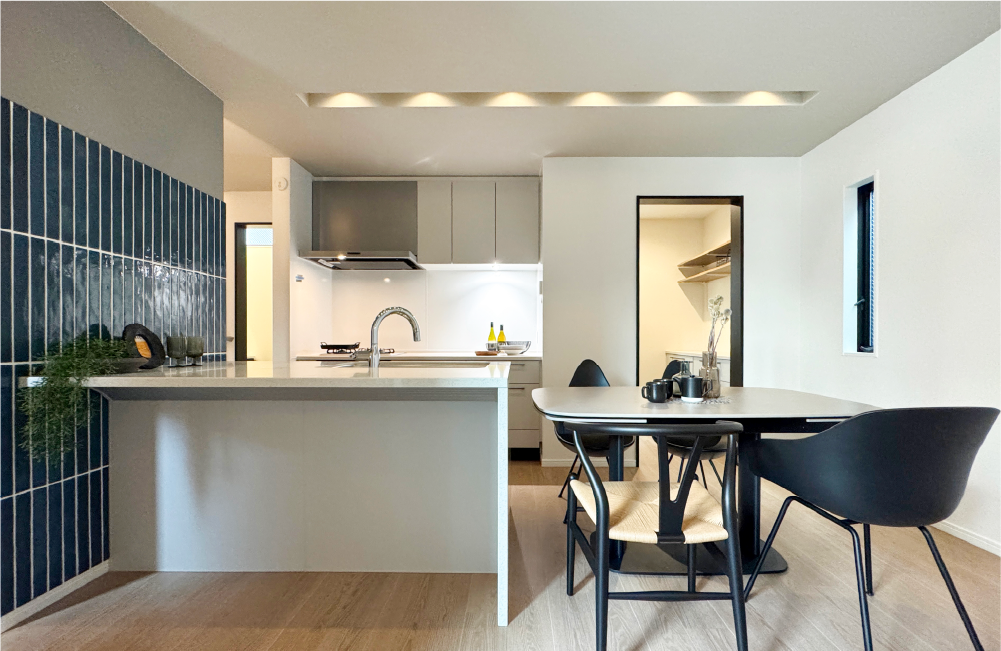 短い動線で作業しやすいセパレートタイプのⅡ型キッチンを採用し、料理のしやすさにこだわりました。ダイニングは横並びの配置で、料理の配膳や後片付けもラクラクです。また、冷蔵庫も収まるパントリーにはカップボードや可動棚を設置し、十分な収納量を確保しています。