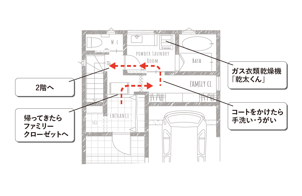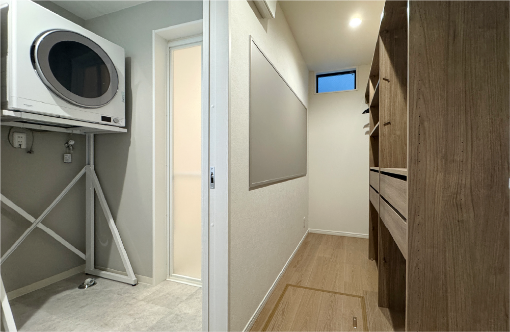 外から帰ったら、ファミリークローゼットに上着をサッとかけて、そのまま洗面・脱衣室へ。手洗いやうがいがスムーズにできる「ただいま動線」です。さらに、ガス衣類乾燥機「乾太くん」を設置。乾いたタオルやパジャマを隣のファミリークローゼットにしまえば、入浴時の準備も楽です。