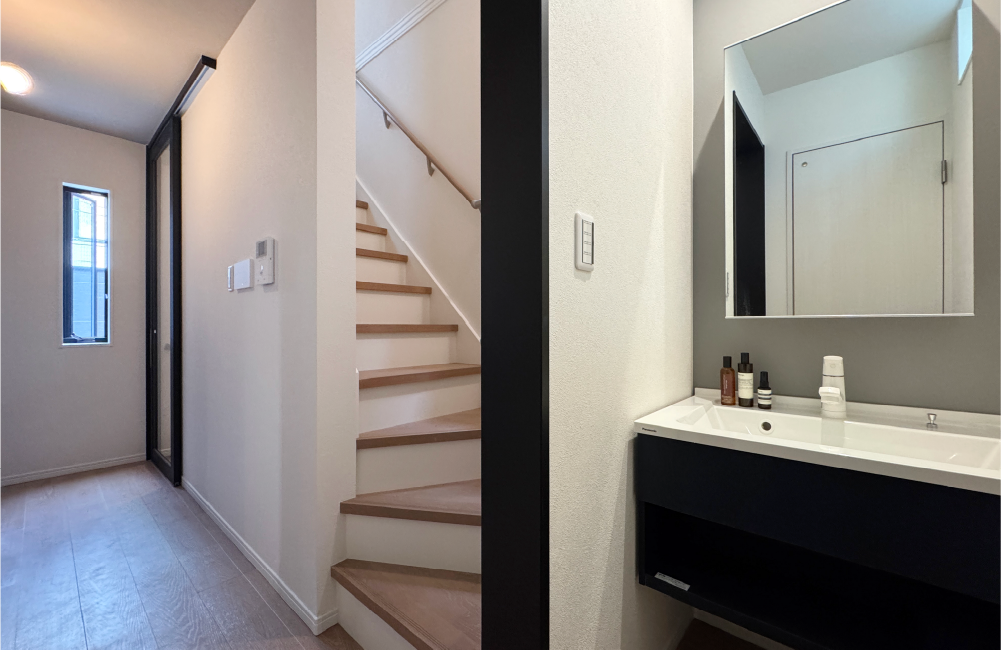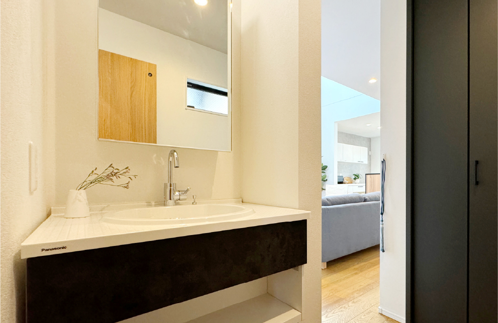 2階にも洗面を設けているので、お客さまにも気軽に使っていただけます。また、1階まで行かずに済むので、朝の忙しい時間帯でもスムーズに身支度ができます。通勤や通学の準備が重なる時間も、1階と2階で分けて使えば混雑を避けられて、快適に過ごせます。