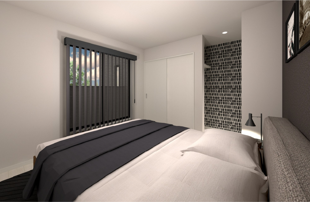 主寝室には造作のヘッドボードを取り入れ、ホテルのような洗練された雰囲気に仕上げました。ヘッドボードは、携帯電話やメガネ、本などを気軽に置けるスペースとして重宝します。扉のないウォークインクローゼットは、収納力をしっかり確保しながら、空間に広がりをもたらします。