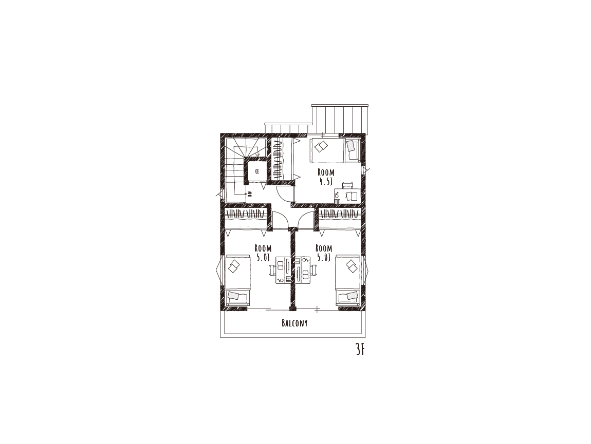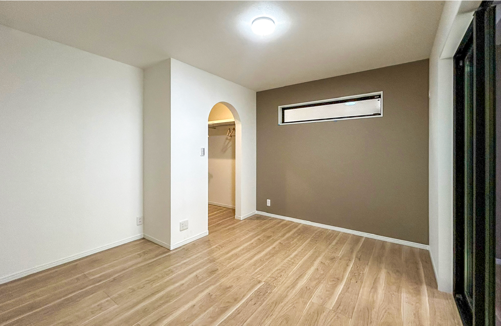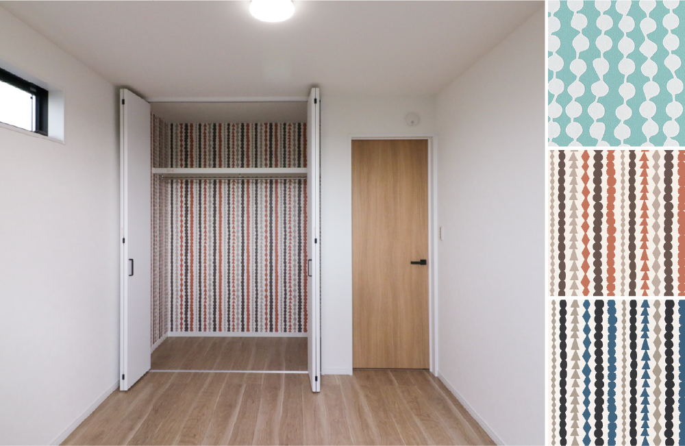 3階に配置された3部屋の居室は、大きな開口部から良質な光をふんだんに取り込むことができるよう工夫しました。クローゼット内のクロスには、チェリー色のフローリングなどナチュラルテイストの室内空間に映え、視覚的にも楽しい遊び心のある柄物のクロスを採用したので、毎日の洋服選びもワクワクと楽しい時間になりそうです。