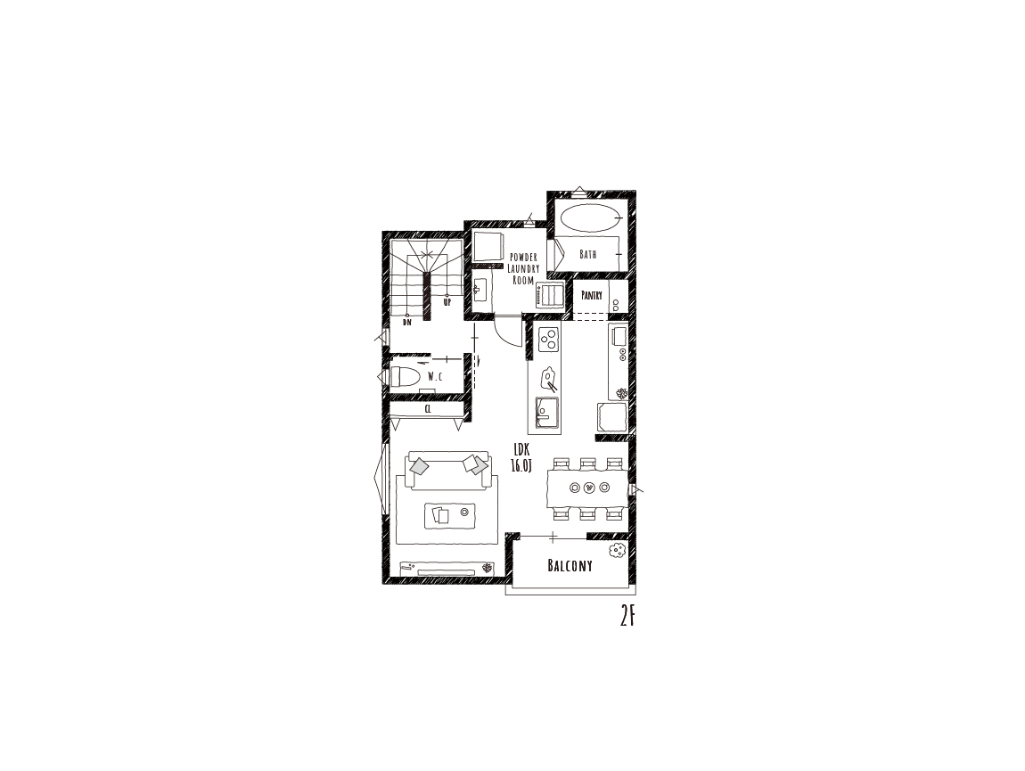 家事の手間を減らして、家族で過ごす時間をもっと大切にしてほしい。家事がラクになれば、生活にゆとりが生まれ、笑顔あふれる家族の時間が増えるでしょう。そんな想いで、LDK+水廻りを2階にまとめたスムーズな動線になるよう考えたお家ができました。ご家族が集まるリビングは折り上げ天井で約2.6mの天井高にし、腰壁のないフラット対面キッチンと組み合わせることで、開放感に包まれた空間を演出します。シューズクロークやウォークインクローゼット、パントリーなど住まいの各所に収納スペースを設け、十分な収納量を確保することで生活空間を広く使えます。また乾太くん(ガス衣類乾燥機)や大容量のフロントオープン食洗機など高品質な設備が、日々の家事の負担を軽減してくれます。子育て世帯や共働きで忙しいご家族が、楽しく過ごせるお家をお届けします。