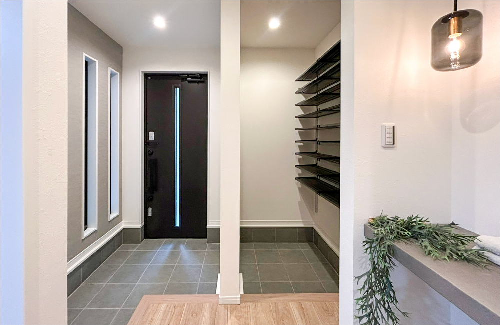 来客時にお客様を気持ちよく迎えられるよう、お客様用とご家族用を分けられる2way動線の玄関としました。ご家族用の玄関はシューズクロークを兼ねていて、ベビーカーやゴルフバッグ、アウトドア用品もゆったりと置ける大容量の収納スペースにもなっています。さらに玄関を入ってすぐの場所にセカンド洗面があるので、帰ってきたらすぐうがいと手洗いの習慣が身に付きます。また1階の主寝室から2階に上がらなくても、寝る前の歯磨きなどができて便利ですね。