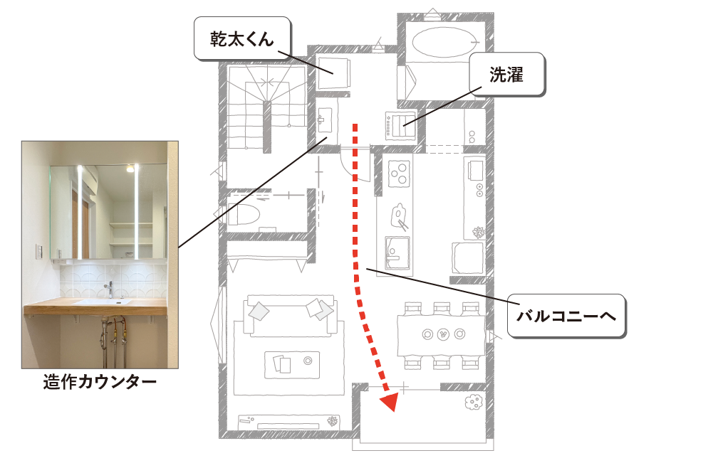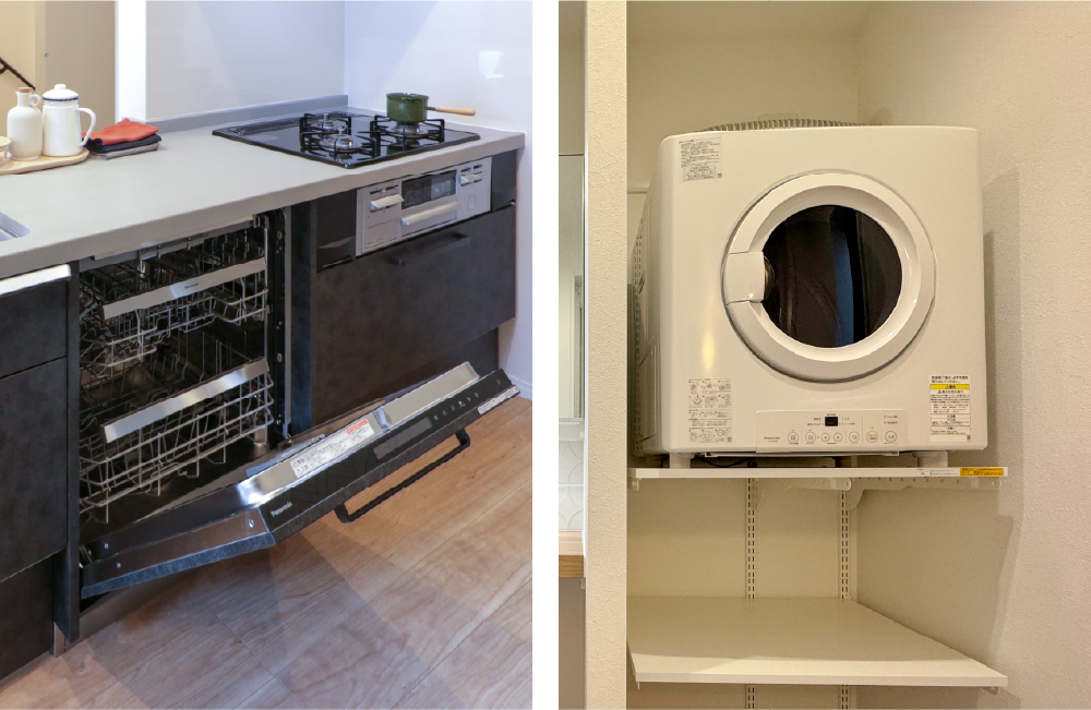 高品質な設備が毎日の家事をもっと楽しく、もっと楽にしてくれます。洗面室にはガスを使用し高温で素早く乾燥させるため、ふんわりと心地よい仕上がりになる「乾太くん(ガス衣類乾燥機)」を設置。キッチンには、手が汚れている時でも水栓を汚さず使用できるタッチレス水栓や食器の出し入れがしやすく一日分の食器や調理器具をまとめて洗える大容量のフロントオープン食洗器を採用しました。家事の時短が叶い、ゆっくり朝食を食べたり、時間に追われず子どもたちとゆっくり遊ぶことができますね。