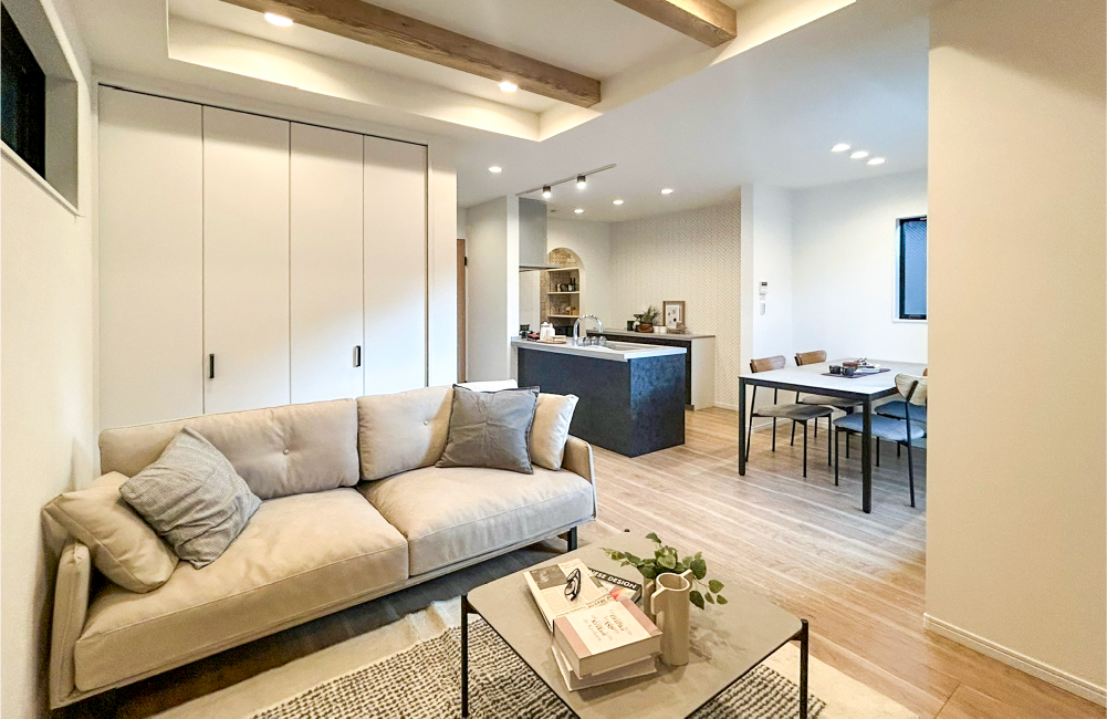 化粧梁を入れた立体的な折り上げ天井でリビングの天井高は約2.6mとなり、開放感とデザイン性を両立したスペースに仕上げました。TV上部に施した柔らかな光が壁を照らす間接照明と背面に採用したグレー系のアクセントクロスが、癒しとくつろぎの空間を上質に彩ります。収納スペースもしっかりと設けているので、気づけばすぐに物であふれてしまうリビングをいつもキレイに保つことができます。