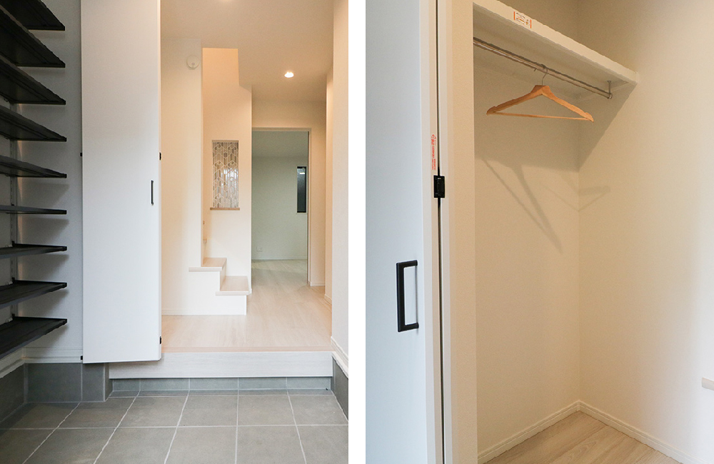 天井まである大きなサイズのシューズクローゼットは、家族全員分の靴をしっかり収納できて、キレイな玄関まわりを保つことができます。靴以外にも、ベビーカーなども収納でき、DIYやガーデニング用品の保管にも便利です。また玄関にハンガーパイプも設置しているので、コートをかけておけば外出時にサッと着ていくことができます。帰宅時にここでコートを脱げば室内にホコリや花粉などを持ち込む心配もありません。