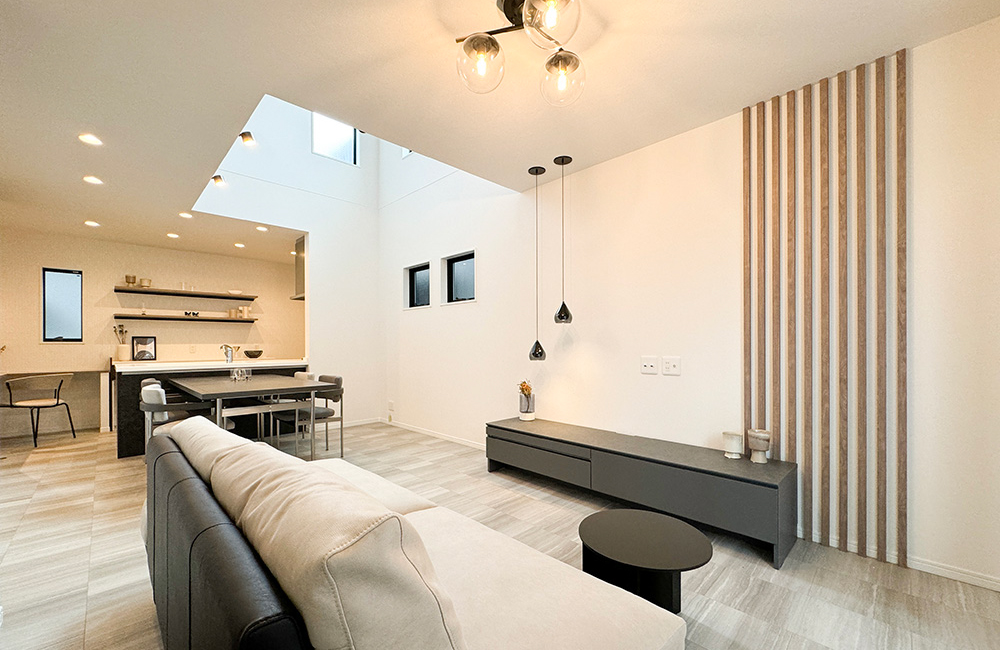 ゆったりソファを置けるリビングは家族団らんの場所。ダイニング上部の吹抜けが演出する開放感が、リビング・ダイニングに実際以上の広がりを与えてくれます。段違いのペンダントライトや壁面に取り付けた木製のルーバーがアクセントとなり、空間に立体感を生み出します。またリビング階段を採用することで、「いってきます」「ただいま」「おはよう」「おやすみ」など何気ない家族のコミュニケーションを自然と育んでくれます。