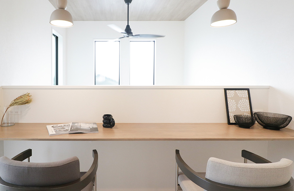 人の目や声を気にせず作業ができる空間として、3階の廊下部分に大きな造作カウンターを設けました。2人並んでもゆったり使用することができるので、子どもたちが一緒に勉強できるスペースにもなります。閉塞感なく落ち着いて集中できる「こもれる空間」でありながら、目の前が吹抜けでLDKとつながっているのでご家族の気配も程よく感じられる心地よい空間です。