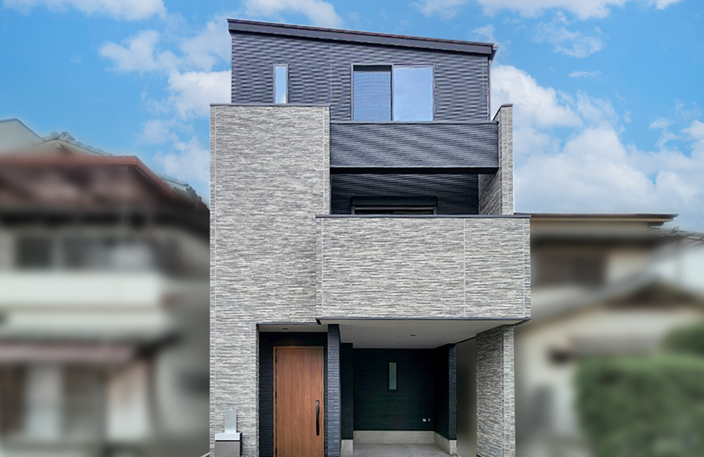 ブラックとグレーを組み合わせた落ち着いた雰囲気の外観、飽きの来ない暮らすほどに愛着が深まる住まいです。