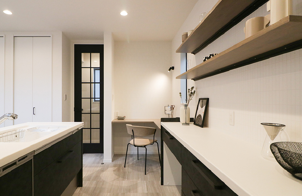 キッチン周りの動線が確保しやすく、開放感のあるフラット対面キッチンを採用しました。キッチン横のカウンタースペースはお料理の合間にレシピを調べたり、空いた時間で読書を楽しむことができます。また料理をしている間も宿題をしている子供たちを見守れたりと、多目的スペースとして活用できます。対面キッチンだから、リビングやダイニングで寛ぐご家族とも会話を楽しみながらお料理をすることができます。