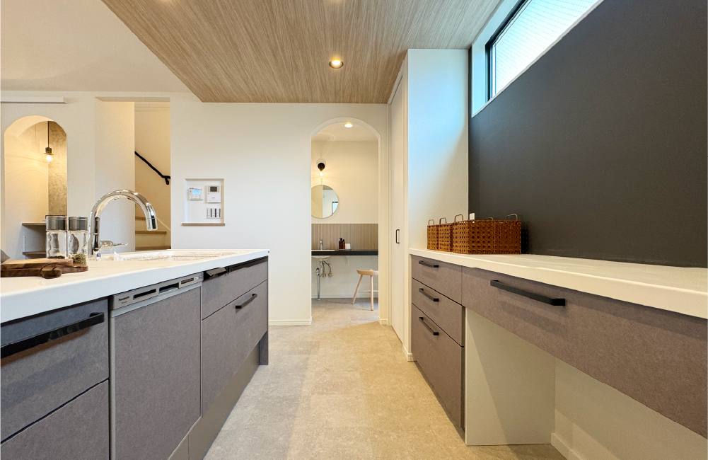 2階にもパウダールームを設置。洗面台が2ヶ所あることで、朝の混雑時もスムーズに身支度が整えられます。ワイドな造作カウンターは、アイロンがけや洗濯物たたみなどの家事スペースとしても活用できる実用的な設計です。