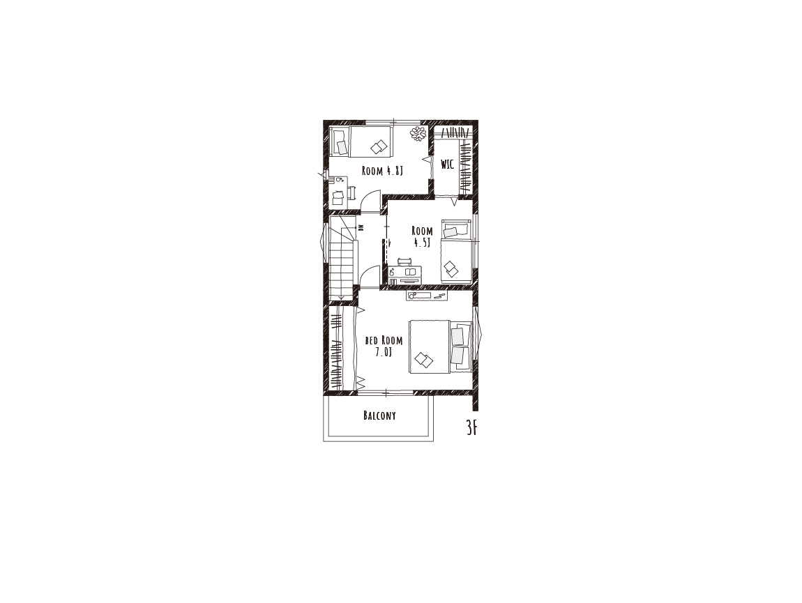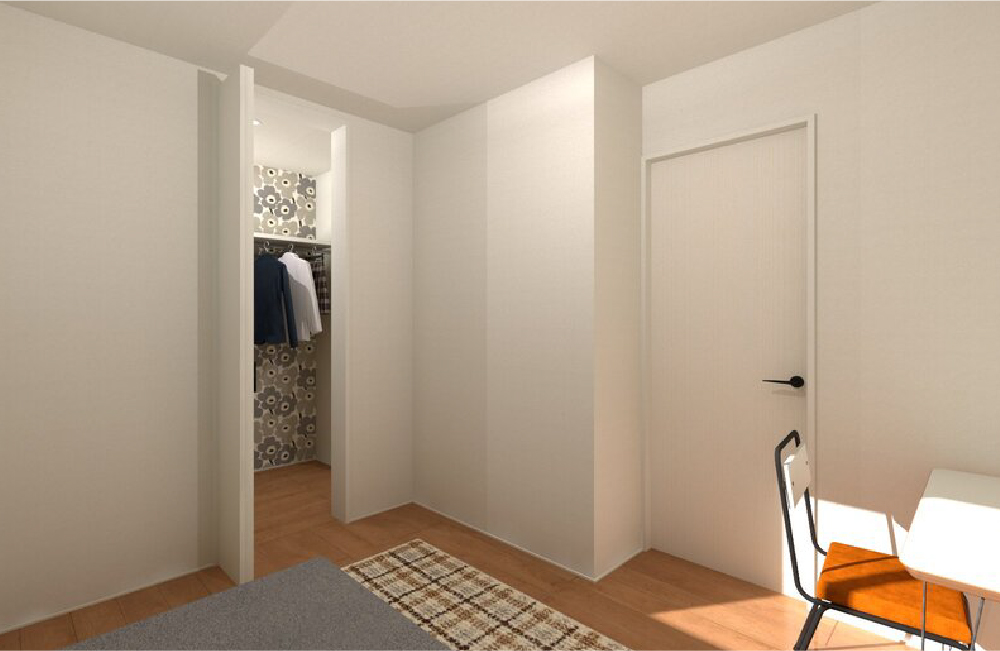 3階の2部屋からアクセスできるウォークインクローゼットは、プライバシーを保ちながら広々とした収納スペースを共有できる便利な設計です。2人分の衣類や小物もゆとりを持って収納でき、居室をいつもスッキリと保てます。
