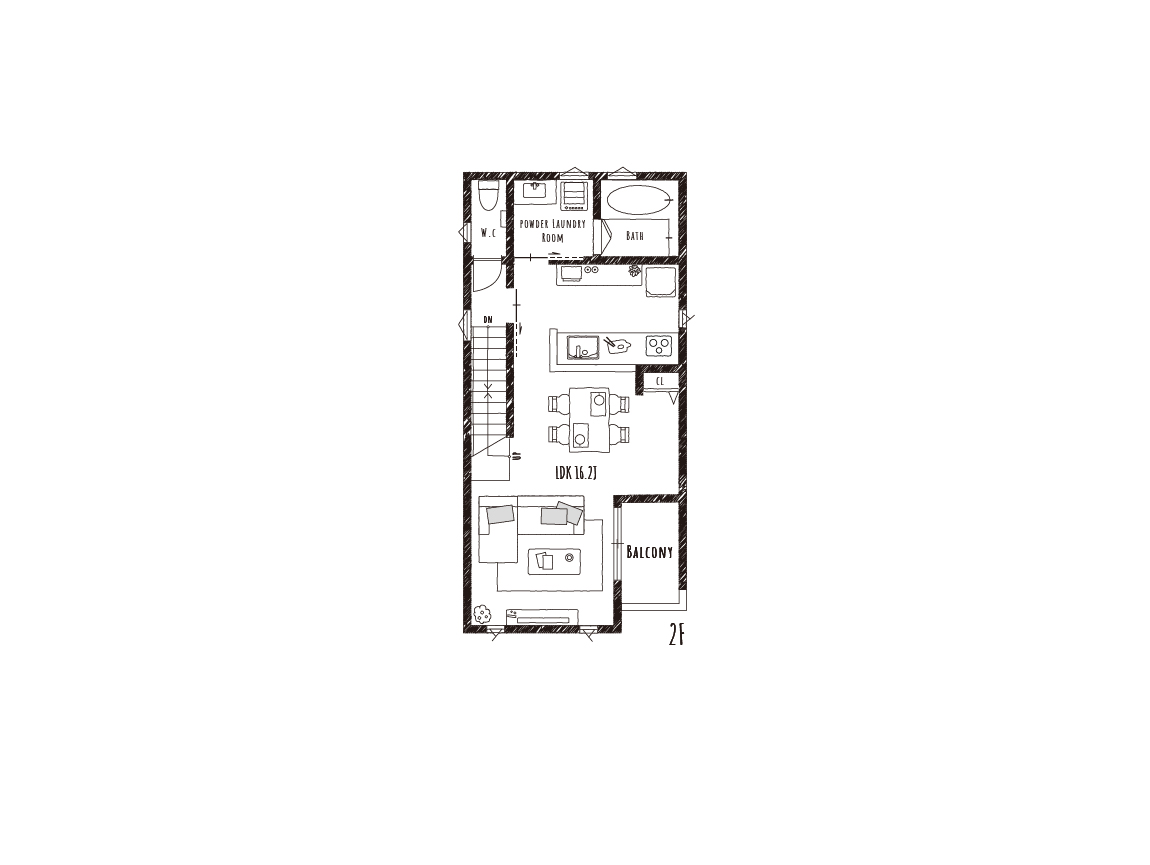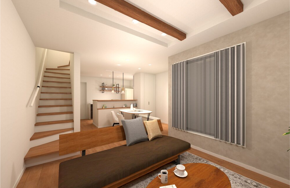折り上げ天井が広がりのある空間を演出し、バルコニーからは心地よい光と風が注ぐ明るいリビング。家族との自然な出会いを生むリビング階段で、日々のコミュニケーションが深まり、豊かな暮らしを実現します。