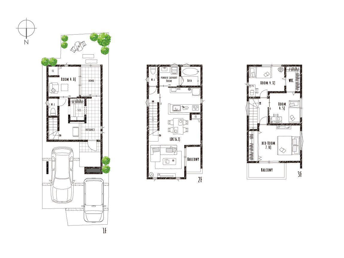アクティブに過ごす家族の毎日を快適にする工夫が詰まったお家が完成します。1階の広々とした土間スペースは、家族全員の靴やアウトドア用品、スポーツ用品をたっぷり収納できるシューズクローゼットを完備。自転車やベビーカーも余裕で置けるため、子どもとのお出かけやアウトドアの準備もスムーズです。広い土間のおかげで、玄関はいつもスッキリと片付き、帰宅後の汚れ物の片付けや掃除も簡単に済ませられます。2階には、料理や洗濯などの家事動線を考え抜いたカウンターキッチンと水回りを集約。忙しい日でも効率よく家事をこなせ、自分の時間も確保できます。3階の2つの洋室からは、それぞれウォークインクローゼットに直接アクセスでき、衣類や荷物をすっきり収納。お部屋を広々と有効活用できます。さらに、夫婦で使える2台分の駐車スペースも確保しているので、週末のレジャーや買い物にも便利。アウトドアやスポーツを楽しむご家族の理想的な暮らしを叶える住まいです。