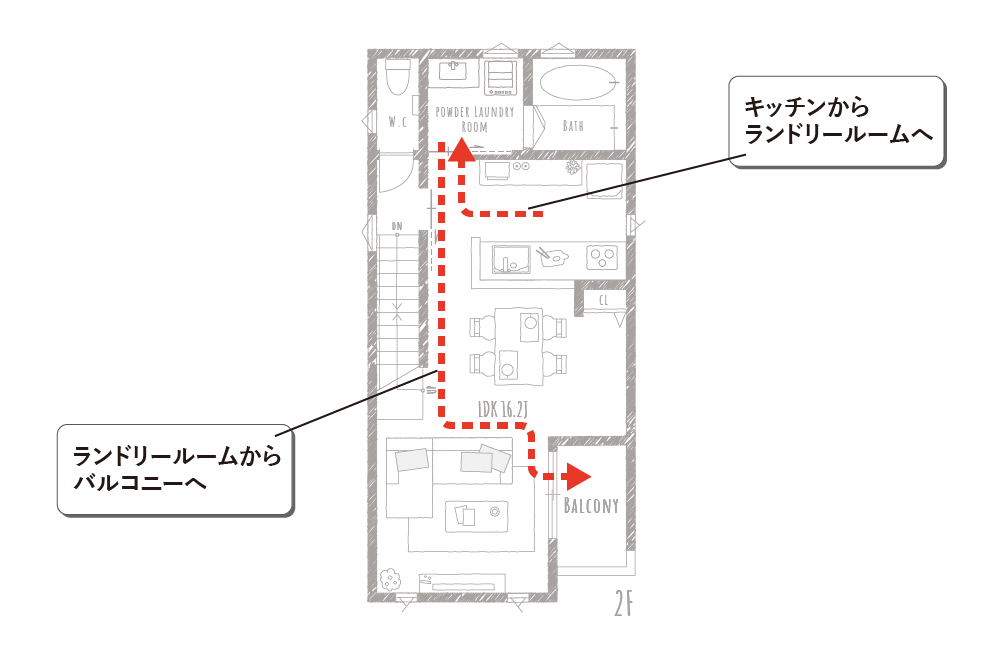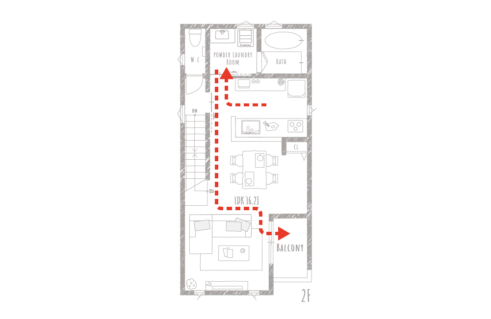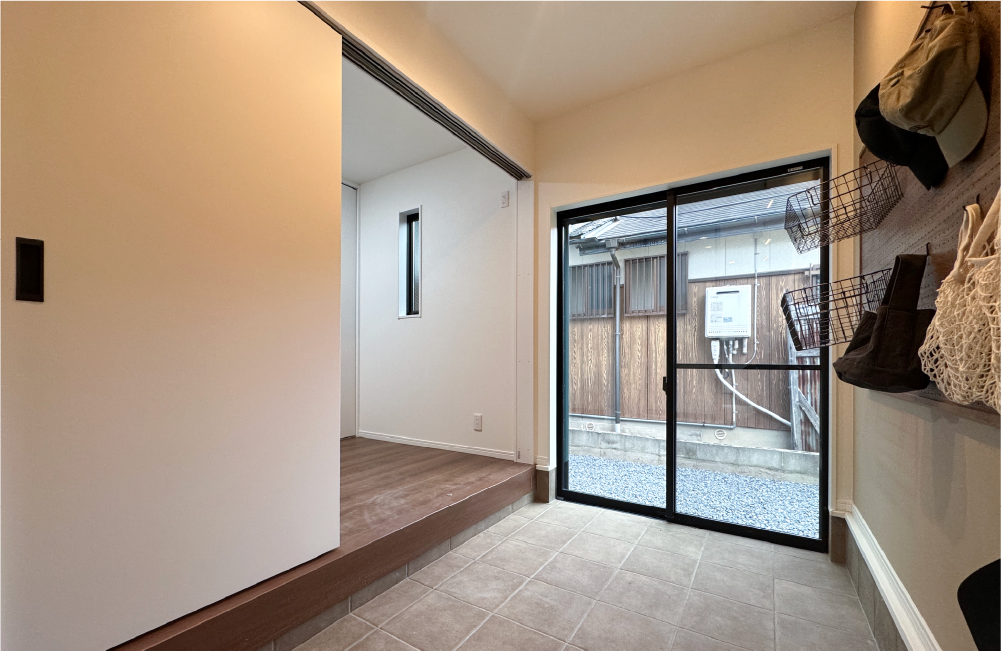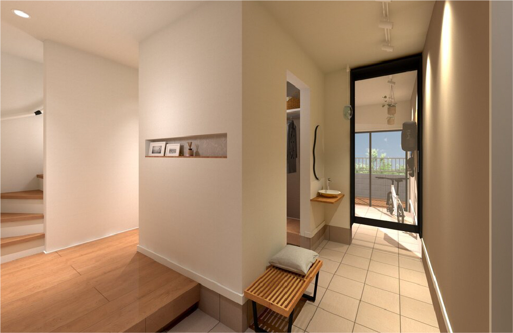 玄関は、シューズクローゼットを通る家族専用と来客用の便利な2way動線を採用。奥の広々とした土間スペースまでつながり、設置されたセカンド洗面台で帰宅時の手洗い・うがいはもちろん、家庭菜園やガーデニングの泥汚れもここで洗い流せるので、室内を清潔に保てます。