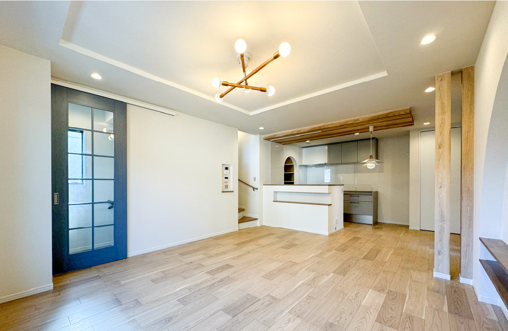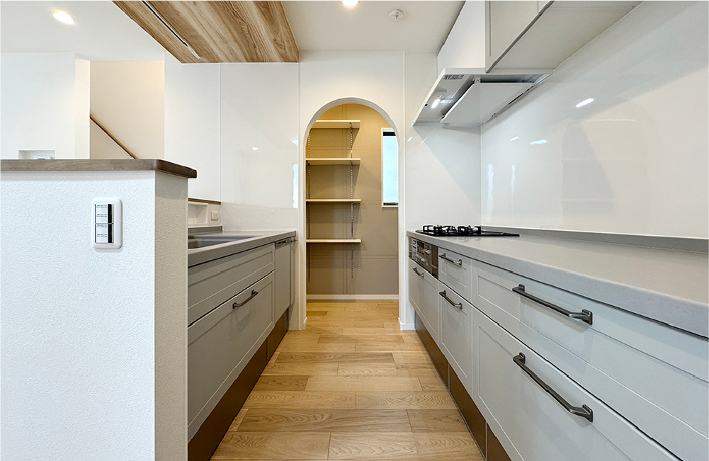 丸みのあるアーチ型の垂れ壁やニッチを住まいの随所に取り入れた、優しい雰囲気が家族を包み込むお家です。南向きのリビングは、陽光がたっぷり降り注ぐ中、折り上げ天井とアーチ型ニッチが魅力的なくつろぎの空間を演出します。セパレートタイプのⅡ型キッチンは動線が短く作業しやすい設計で、奥には便利なパントリーも備えています。玄関には土間続きのシューズクローゼットをはじめ、豊富な収納スペースを確保しているので、いつもスッキリした空間を保てます。さらに、洗面室とランドリールームを分けることで、使い勝手の良さを追求。主寝室にはアーチ型の可愛いウォークインクローゼットを設けるなど、毎日が楽しくなる工夫が詰まった住まいです。