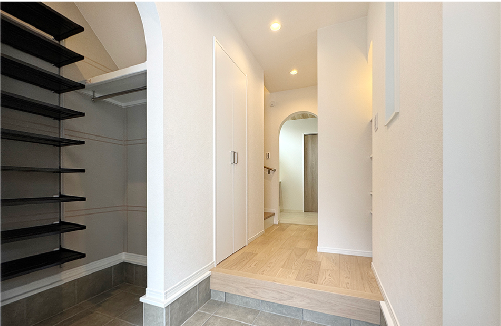 玄関脇のシューズクローゼットは、子どもの外遊びのおもちゃやガーデニング用品を収納するのにぴったり。ハンガーパイプも備えているので、アウターを掛けておけてとても便利です。さらに、飾り棚となるニッチもあるので、お気に入りの小物を並べて自分らしい空間に仕上げられます。