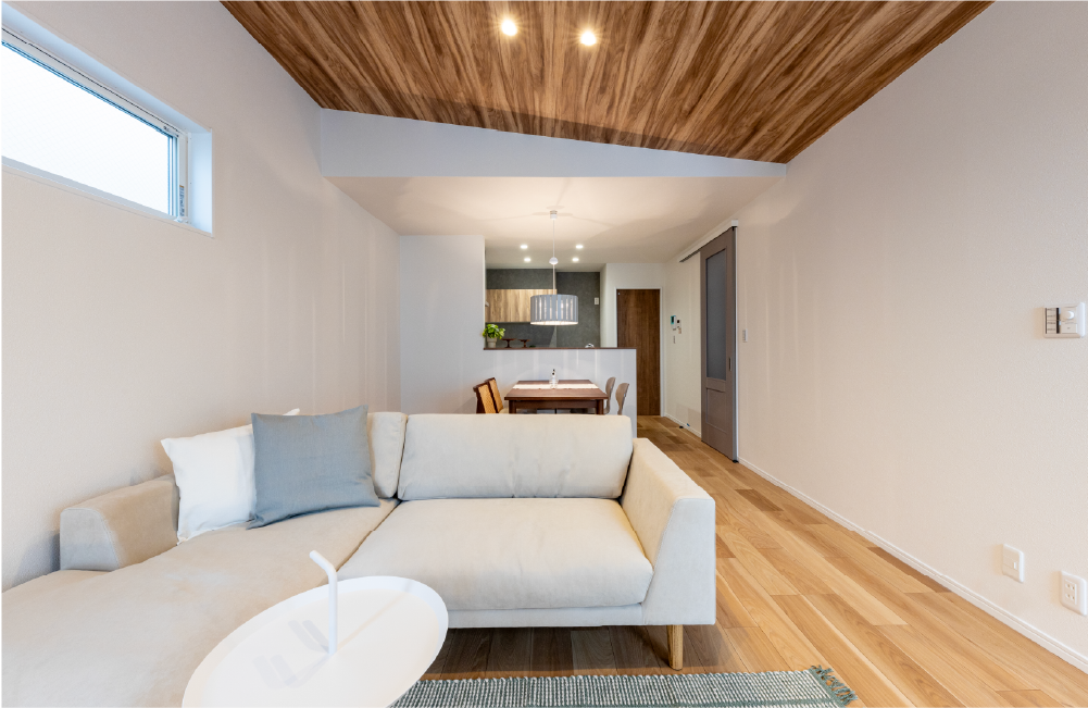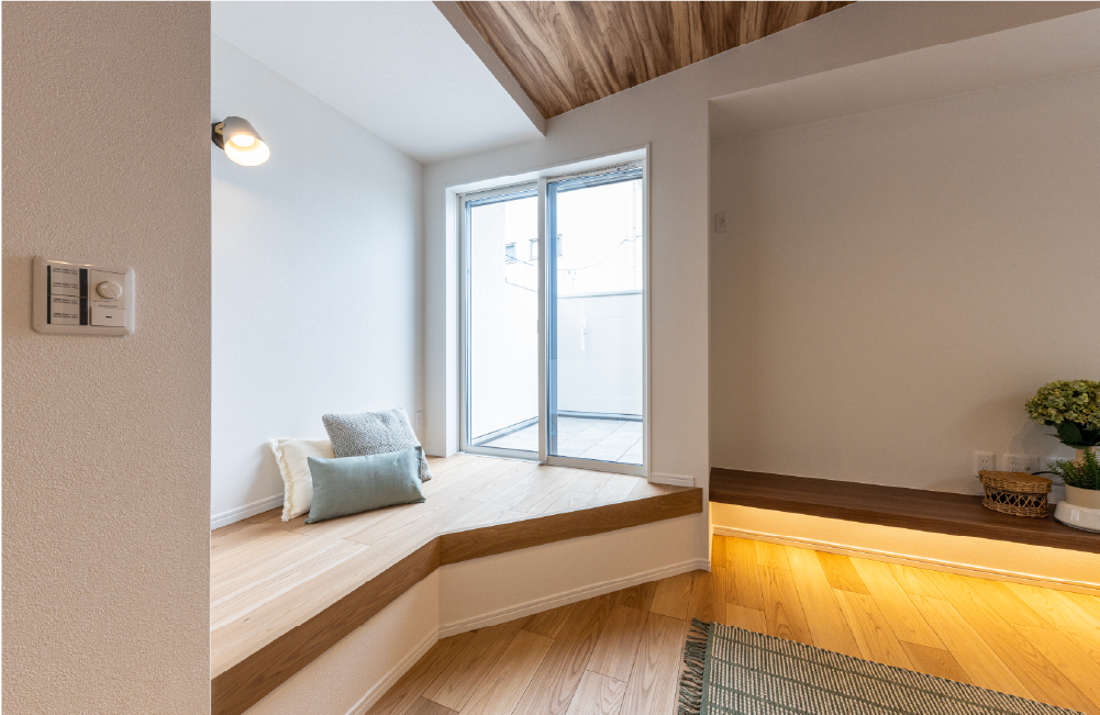 心地よい開放感とたっぷりの陽射しに包まれた空間で、家族みんなが楽しいひとときを過ごせるお家です。LDKを2階に配置することで、縦への広がりも演出できる勾配天井を実現。リビングの天井高は最大2.9mで、開放感いっぱいのスペースになっています。そんなリビングの一角には、ほっこりと落ち着くことのできる小上がりのヌックを設けました。子どもと並んで座って絵本を読み聞かせたり、午後のティータイムにリラックスしたり、夜にはゆっくりと夫婦でお酒を楽しんだりといろいろな使い方が可能です。1階はそれぞれがプライベートな時間をゆっくり過ごすことができる空間、2階は家族がみんなが楽しい時間を共有できる空間とメリハリのある暮らしができる住まいです。