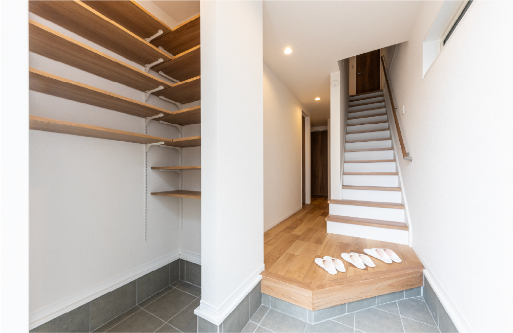 家族全員分の靴はもちろん、アウトドア用品やガーデニング用品など少し汚れが気になるものの収納にもぴったり。ベビーカーをたたまず置けたり、ゴルフバッグなど大きなものも収納できます。ロールカーテンなどを設置すれば、来客時にもキレイな玄関で気持ちよく迎えられます。