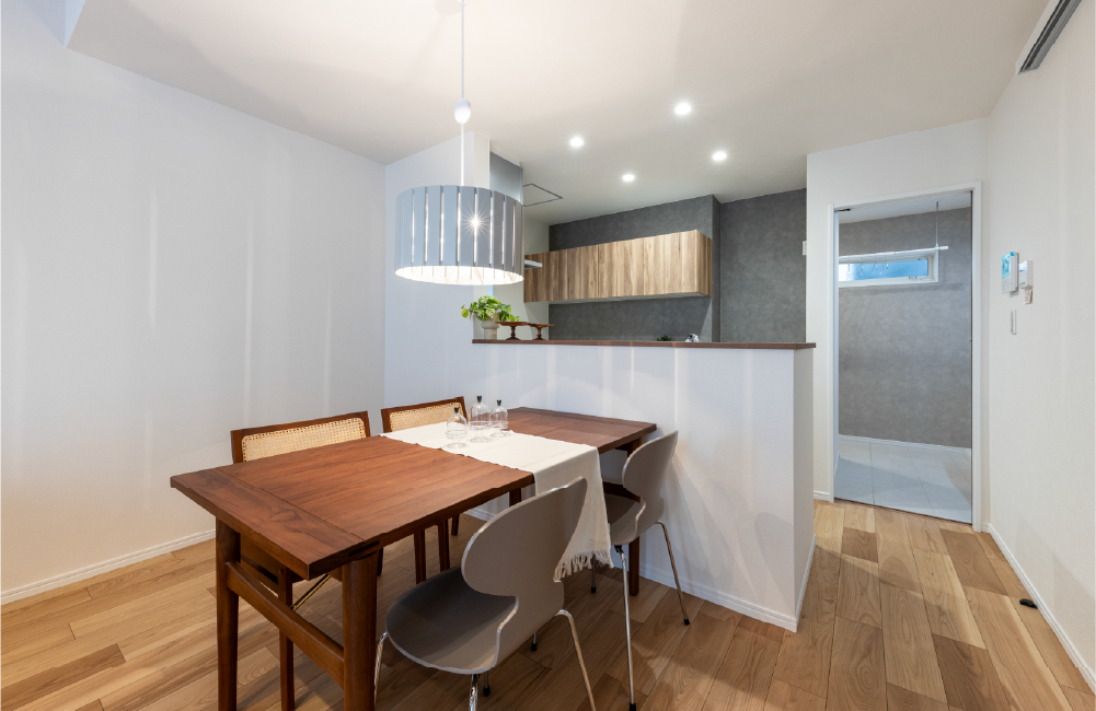 家族が集まるLDKを2階にすることで、開放感を生み出す勾配天井を実現しました。またダイニング・キッチンの上部を折り下げ天井にすることで、ゆるやかにゾーニングするとともにリビングにさらなる広がりをもたらします。開放的な明るい空間には、家族の笑顔が溢れます。