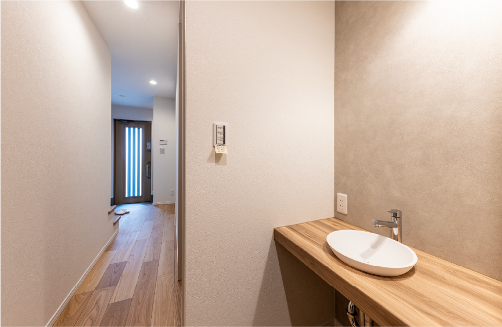 各居室の真ん中にセカンド洗面を設置しました。わざわざ洗面室まで行かなくても手洗いやうがいができたり、掃除のために2階にあがらなくても水が使えて便利。洗面台が2ヶ所にあれば、込み合う朝の時間帯でも2階と分かれて洗面台を使えるので余裕をもって身支度できます。
