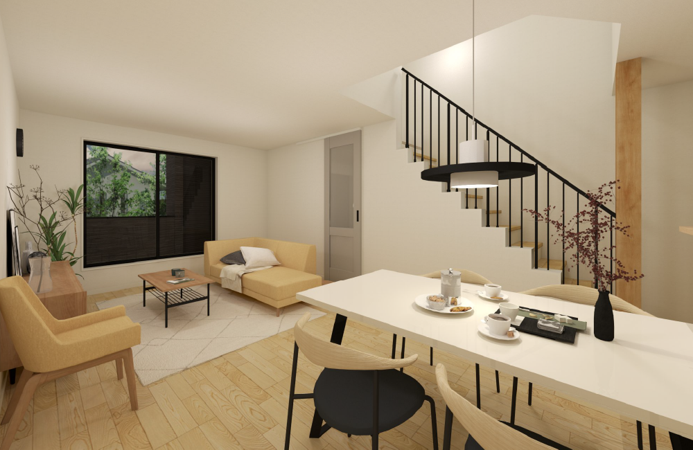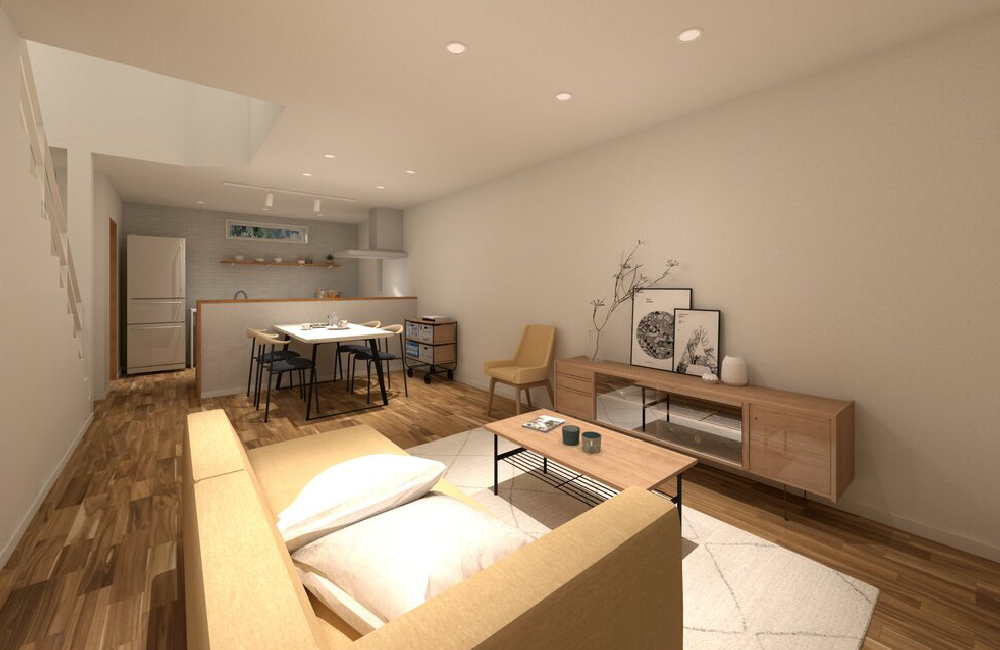 家族の時間を大切にしながら、家事も気持ちよくこなせる、やさしさに包まれたお家です。リビングはインナーバルコニーに面した、やわらかな光が差し込む心地よい空間。自然と家族が集まり、くつろげる場所になっています。リビング階段を取り入れているので、顔を合わせる機会も増え、毎日にあたたかな会話が生まれます。キッチンはLDK全体が見渡せる対面式で、隣には便利なパントリー付き。ランドリールームは洗面室と分かれており、造作カウンターでたたむ・アイロンがけなどの作業も快適。さらに隣接するファミリークローゼットで、収納までがスムーズにつながります。家族との時間を大切にしながら、毎日の家事も気持ちよくこなせる、やさしい住まいです。