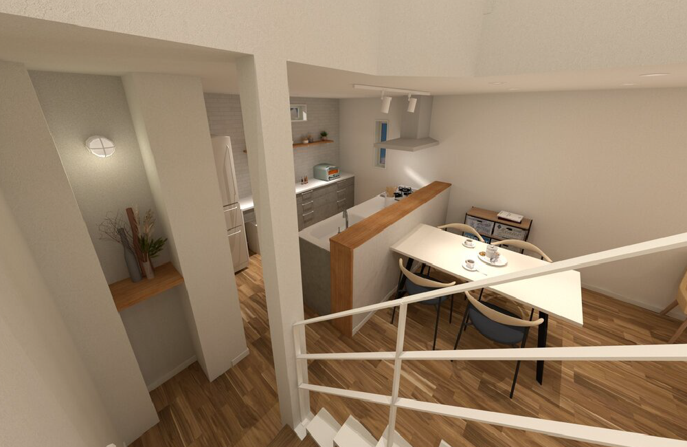 吹抜けからやさしい光が降り注ぐ、開放的で明るいダイニング。吹抜けを通して3階で過ごすお子さまたちの様子がわかるから、「ごはんできたよ!」の声もすぐに届きます。家族の気配をいつも身近に感じながら、それぞれが思い思いに過ごせる、あたたかく居心地のいいダイニングです。