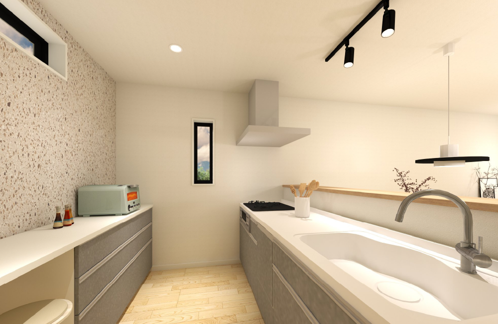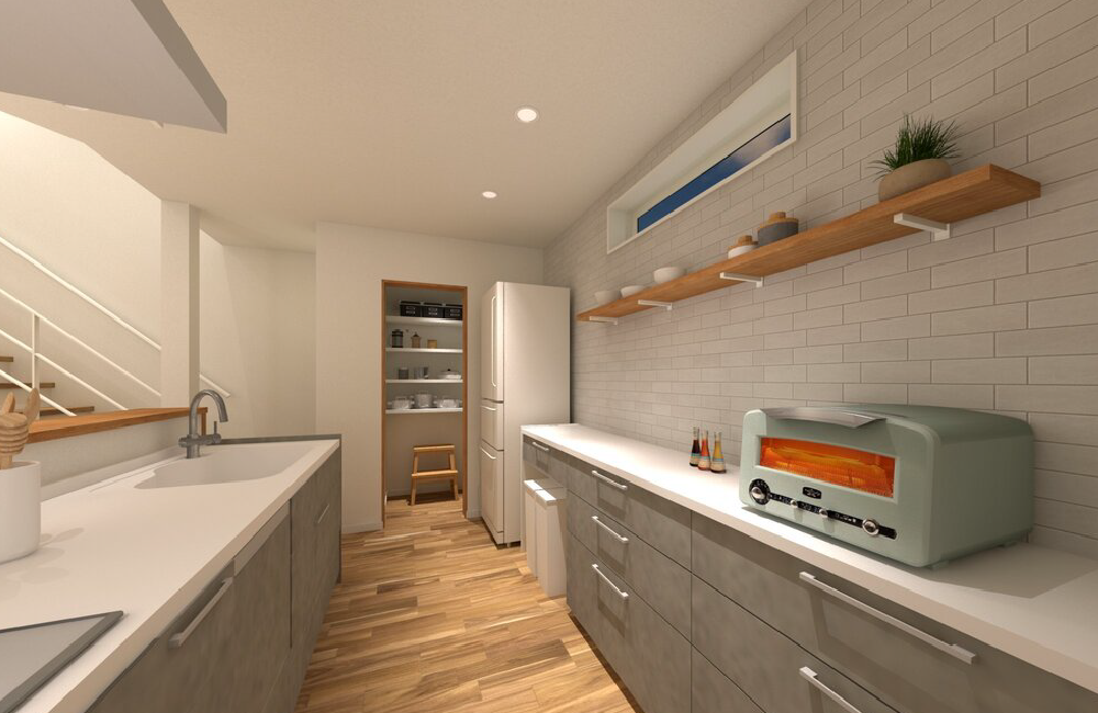 リビングやダイニングでくつろぐ家族の様子を見守りながら、楽しく料理ができる対面キッチン。すぐ隣のパントリーには、食材や日用品をたっぷり収納でき、必要なものがすぐに取り出せて、とても便利です。家族との会話を楽しみながら、毎日の暮らしがもっと快適になるキッチンです。
