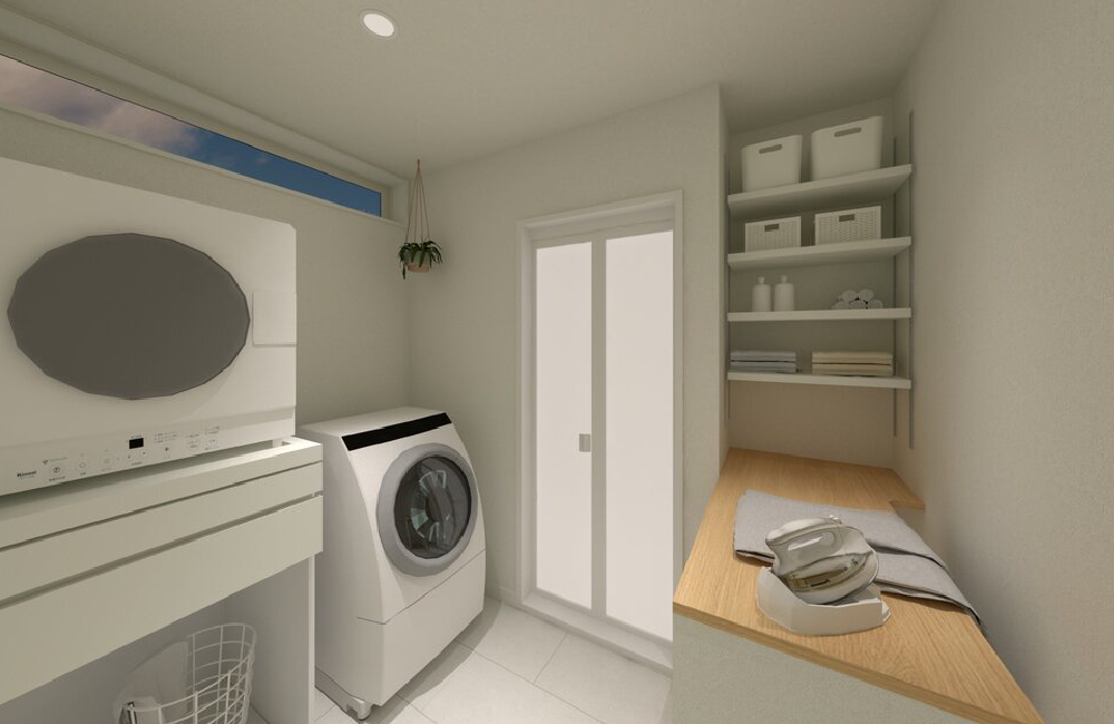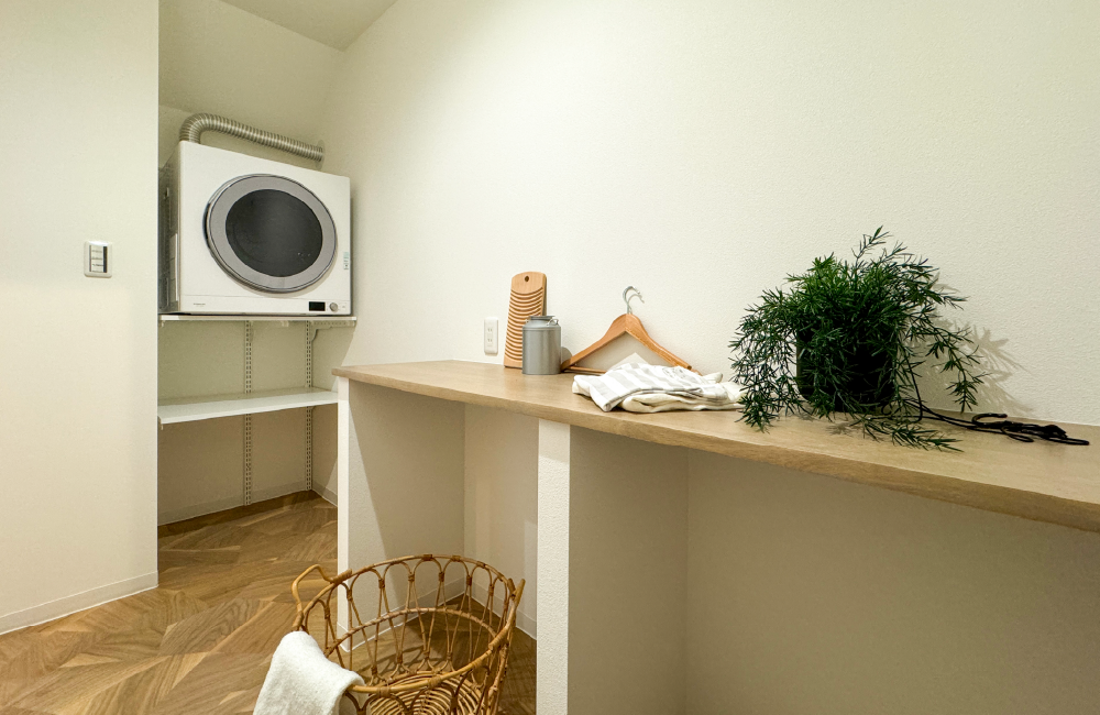 洗面室と分けることで、使いやすさにこだわったランドリールームをつくりました。造作のカウンターを設置しているので、乾いた洗濯物をその場でたたんだり、アイロンがけもできます。さらに、すぐ隣にはファミリークローゼットがあるので、畳んだ洗濯物の収納もスムーズです。