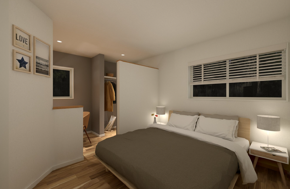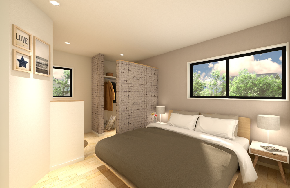 主寝室には、ウォークインクローゼットを設置。洋服はもちろん、スーツケースや季節家電などの大きなものもすっきり収納できます。隣には、メイクやワークスペースとして使える造作カウンターを設置。腰壁でほどよく仕切られているので、落ち着いて作業や身支度ができる快適な空間です。