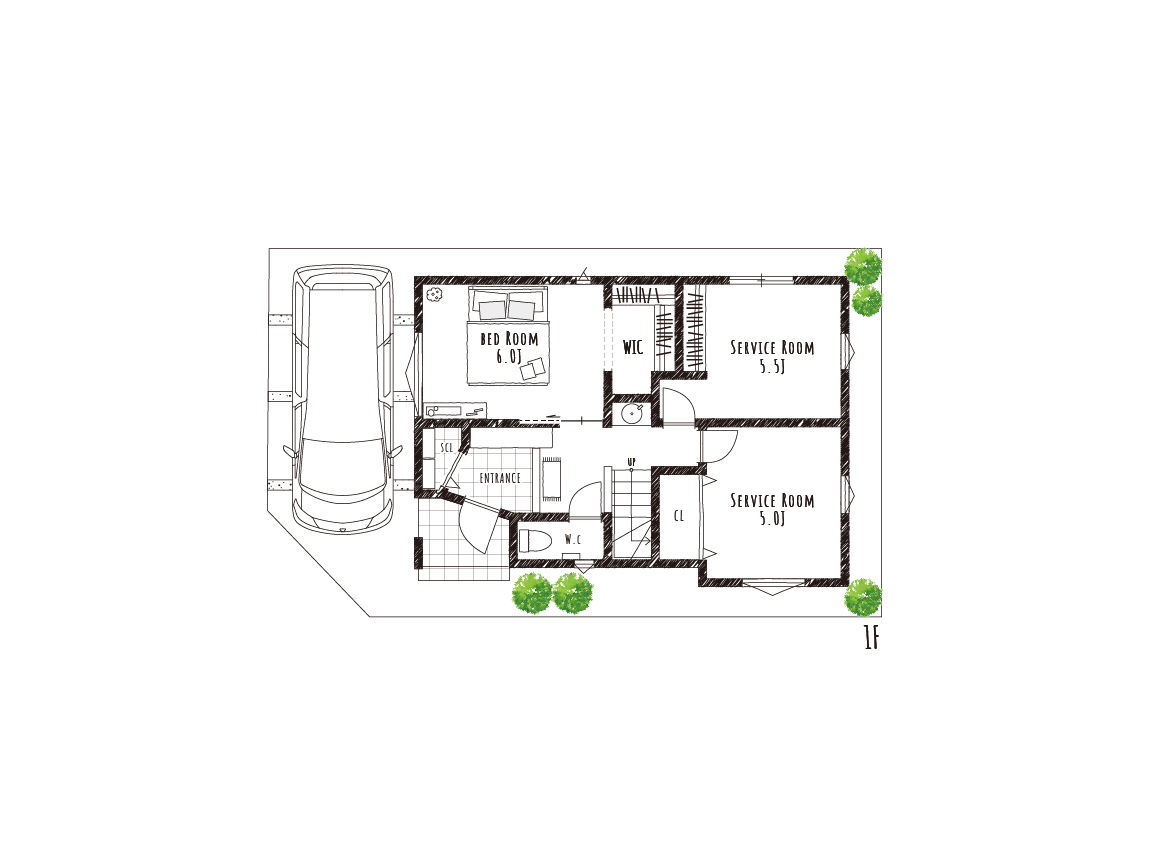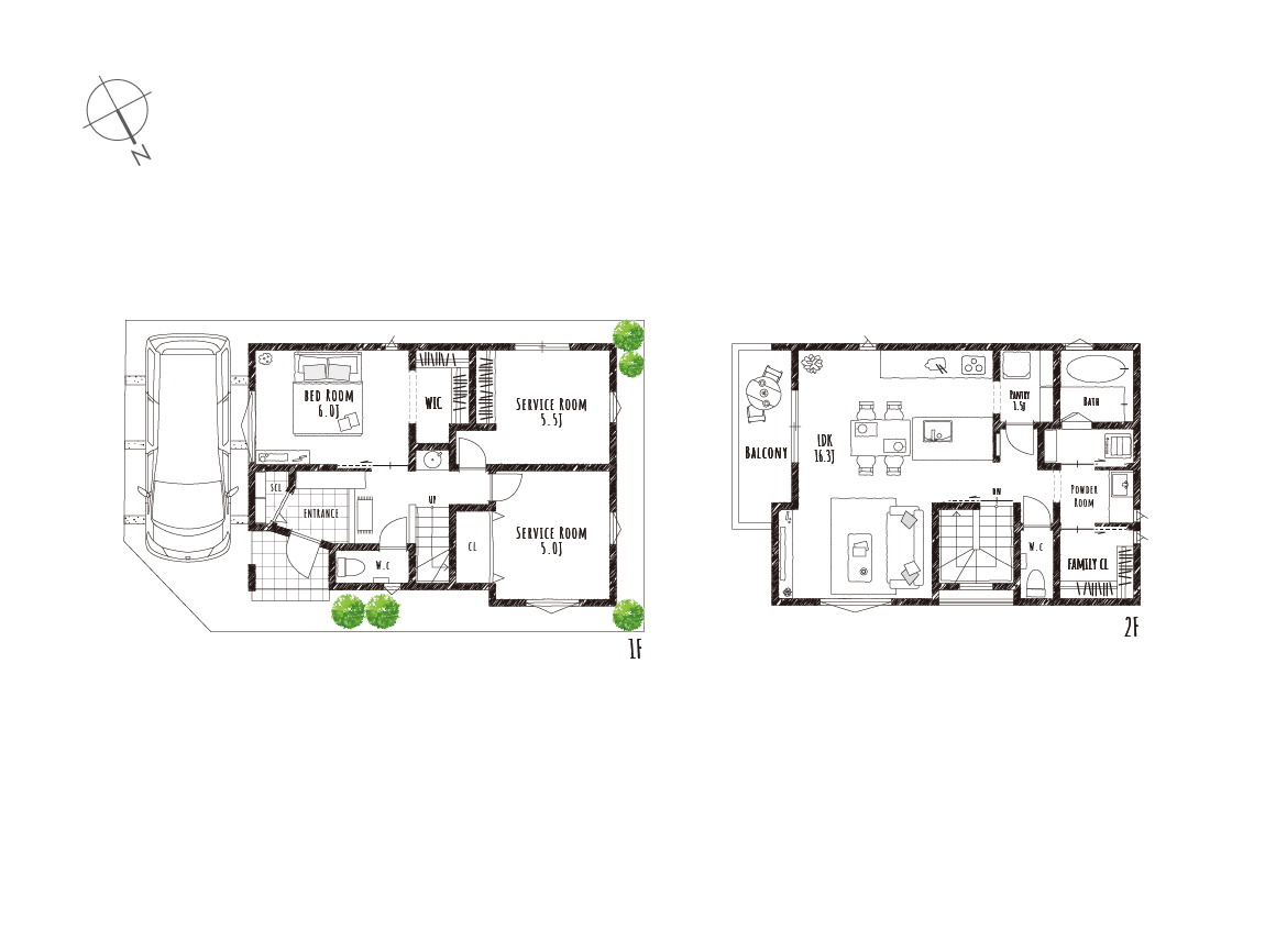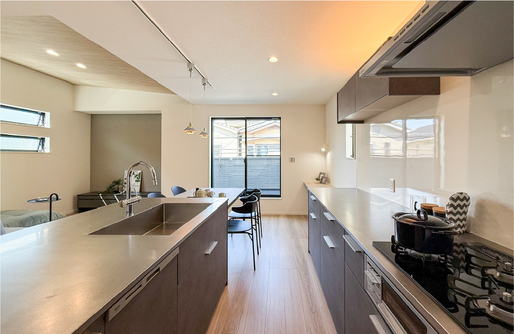 家族みんなが快適に過ごせる、開放感あふれるお家です。室内は角地ならではの広がりを感じられ、心地よい陽光と爽やかな風に包まれます。2階にあるリビングは勾配天井を採用し、最大約2.9mの天井高で開放的な空間を演出。キッチンは作業しやすいセパレートタイプのⅡ型キッチンを採用し、隣には2WAY動線のパントリーも備えました。階段側からも出入りできるので、買い物帰りもスムーズにキッチンへ向かえます。また、洗面室と脱衣室を分けることでプライバシーを確保。すぐ隣にファミリークローゼットがあり、スムーズな動線で入浴時や朝の身支度を行えます。家事がしやすく、家族みんなが心地よく過ごせる工夫が詰まった住まいです。