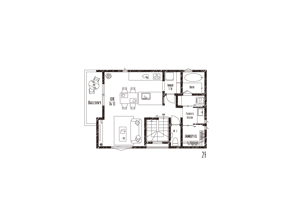 シンクからコンロへは、振り向くだけで移動できる便利なⅡ型キッチンを採用しました。隣には、家事をしたり、お子さまのスタディコーナーとして使える広々としたカウンターを設置。さらに、キッチン側と階段側の両方から出入りできる2WAY動線のパントリーも備えています。